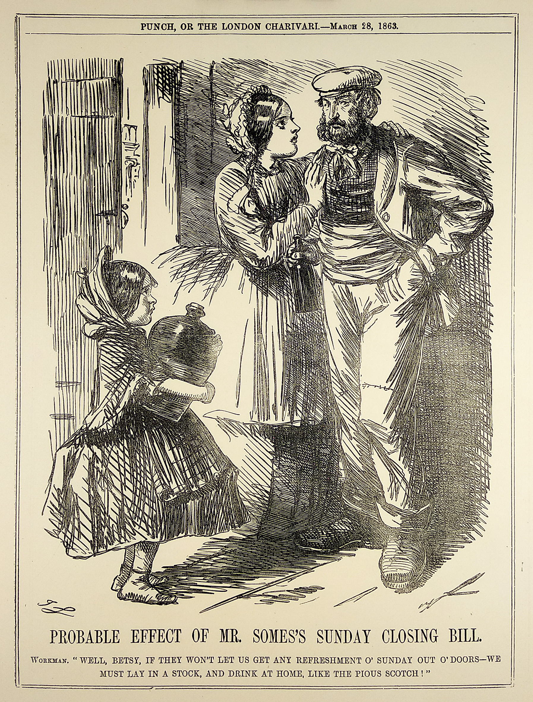 Amusing cartoon from the original edition of Punch. (Workman. “Well, Betsy, if they won’t let us get any refreshment o’sunday out o’doors – we must lay in a stock, and drink at home, like the pious scotch!”)