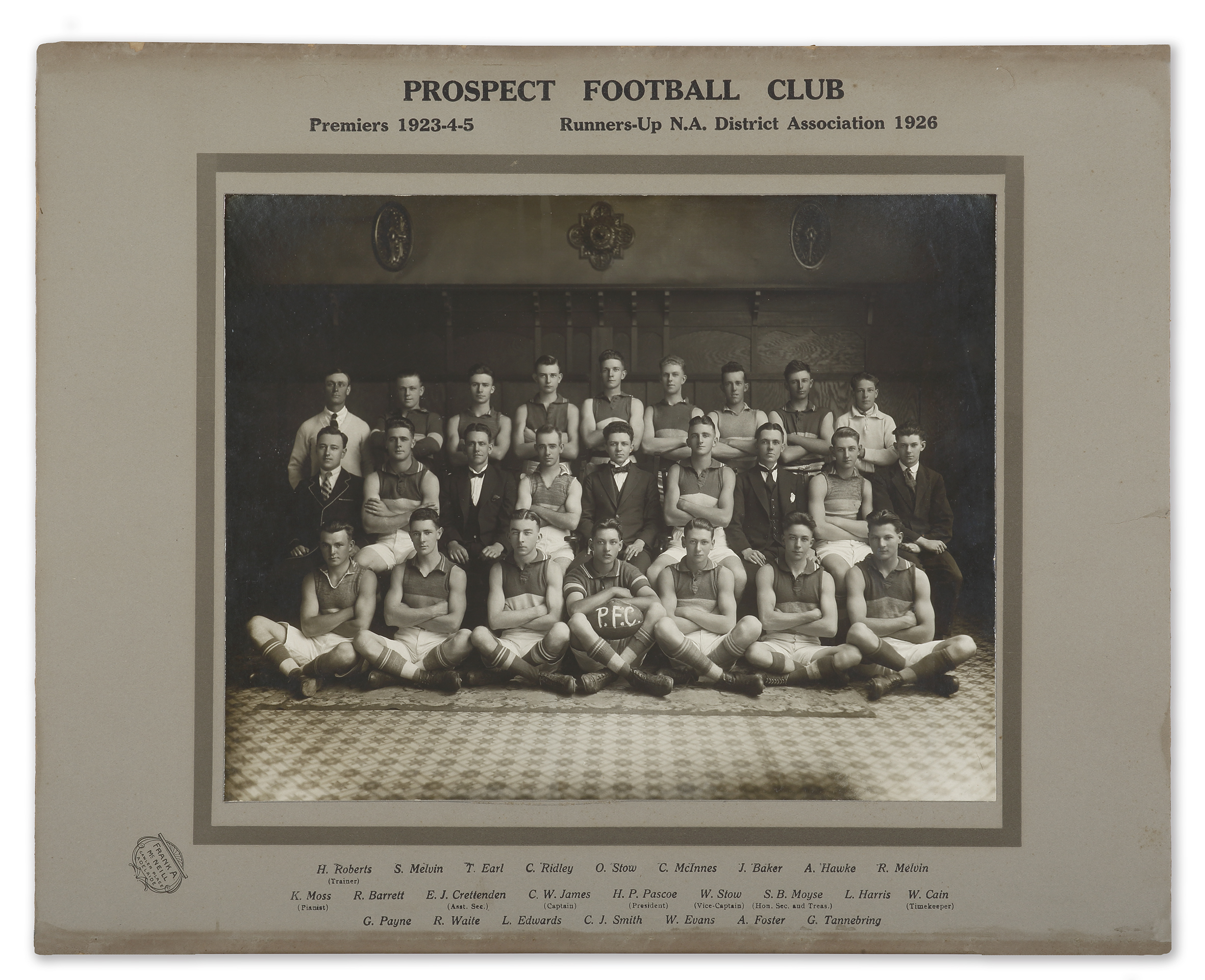 Rare original photograph of the Prospect Football Club, runners-up in North Adelaide District Association competition for 1926 season. Back row (from left): H.Roberts (trainer), S.Melvin, T.Earl, C.Ridley, O.Stow, C.McInnes, J.Baker, A.Hawke, R.Melvin. Middle row (from left): K.Moss (pianist), R.Barrett, E.J.Crettenden (asst. sec.), C.W.James (captain), H.P.Pascoe (president), W.Stow (vice-captain), S.B.Moyse (hon. sec. & treasurer), L.Harris, W.Cain (timekeeper). Front row: G.Payne, R.Waite, L.Edwards, C.J.Smith, W.Evans, A.Foster, G.Tannebring.