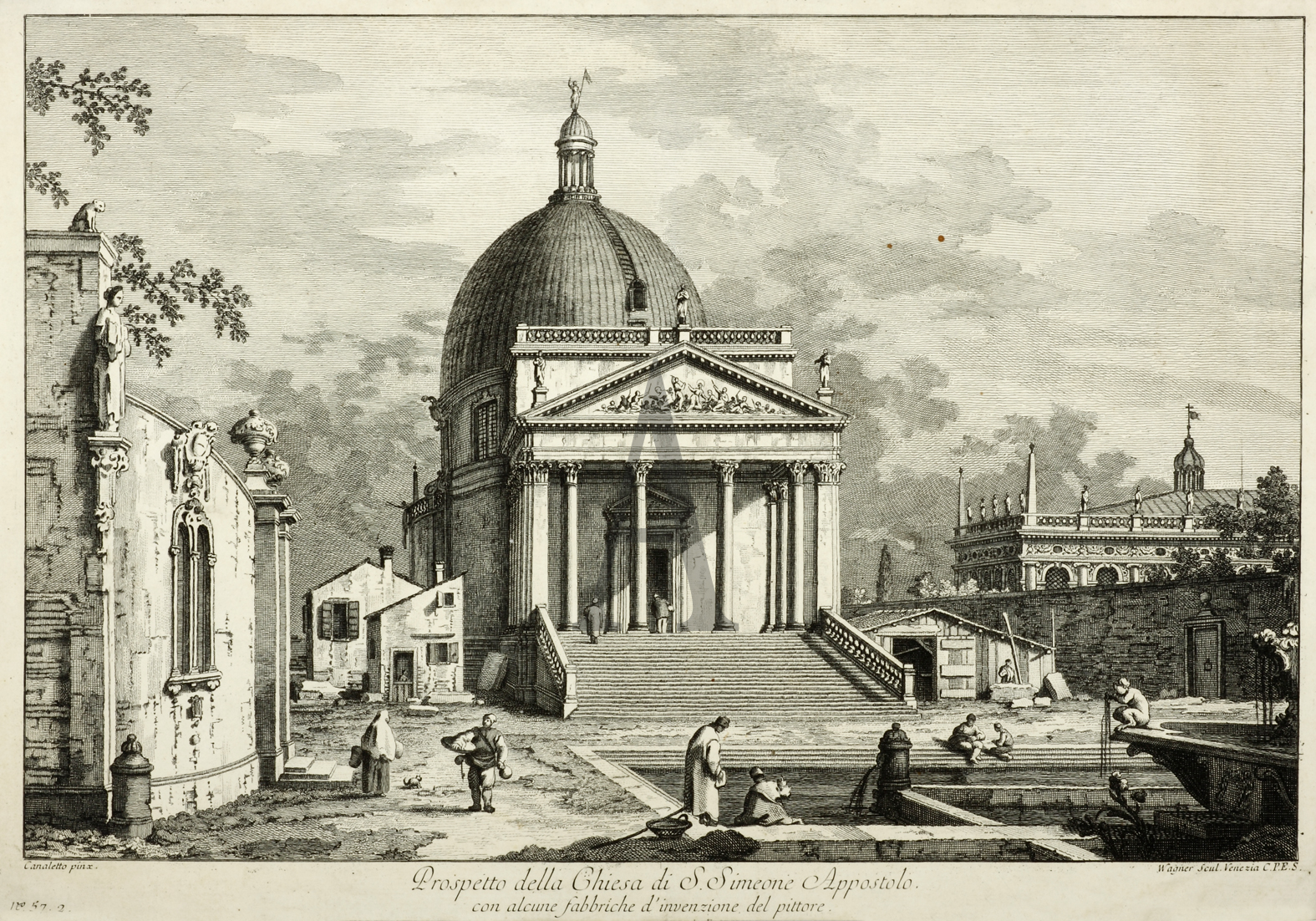 Prospetto della Chiesa di S.Simeone Appostolo cone alcune fabbriche d'invenzione del pittore. - Antique Print from 1755