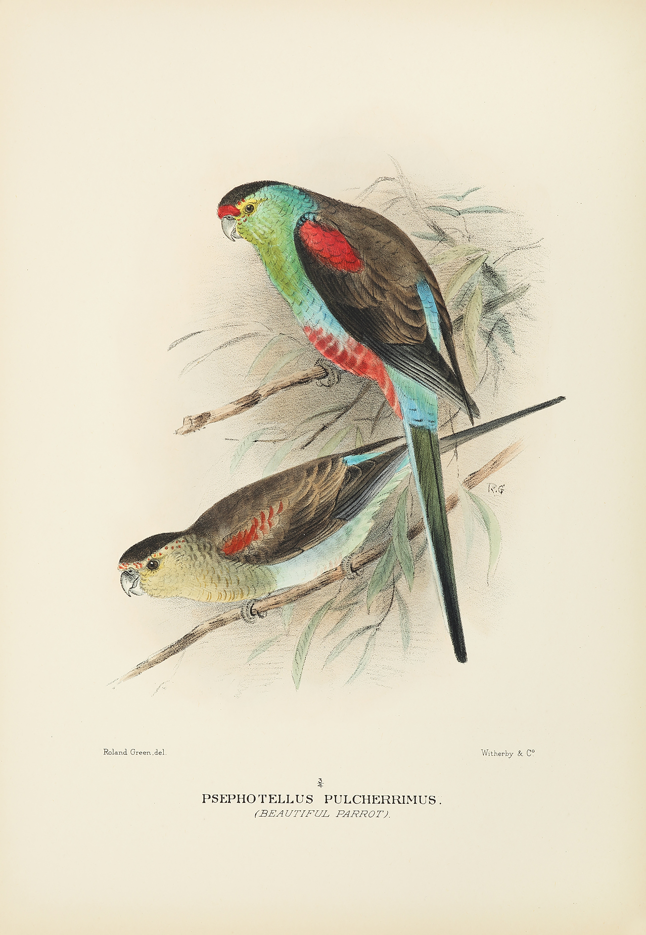 Superb lithograph with original hand colouring of the presumed extinct Paradise Parrot from the last great series on Australian ornithology, The Birds of Australia by G. Matthew’s. Presumed extinct, last sighting was in 1921 when C.H. Jerrard, a cattleman in the Burnett River Region of Queensland reported having found an occupied nest. To prove his claim, he sent photographs of birds at their nest in a termite mound. Today these photographs remain the only ones of the living birds ever taken.