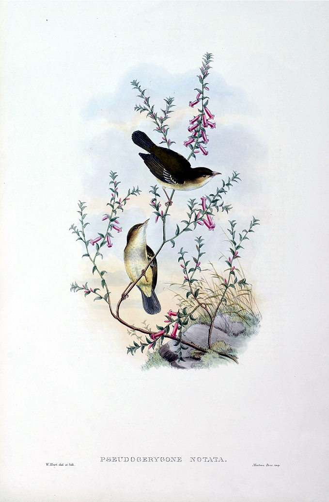 From the original edition of John Gould’s, The Birds of New Guinea & Adjacent Islands. Gould common name : White-spotted flycatcher Gould binomial name : Pseudogerygone notata Modern common name : Yellow-bellied gerygone Modern binomial name: Gergone chrysogaster Described : … Read Full Description