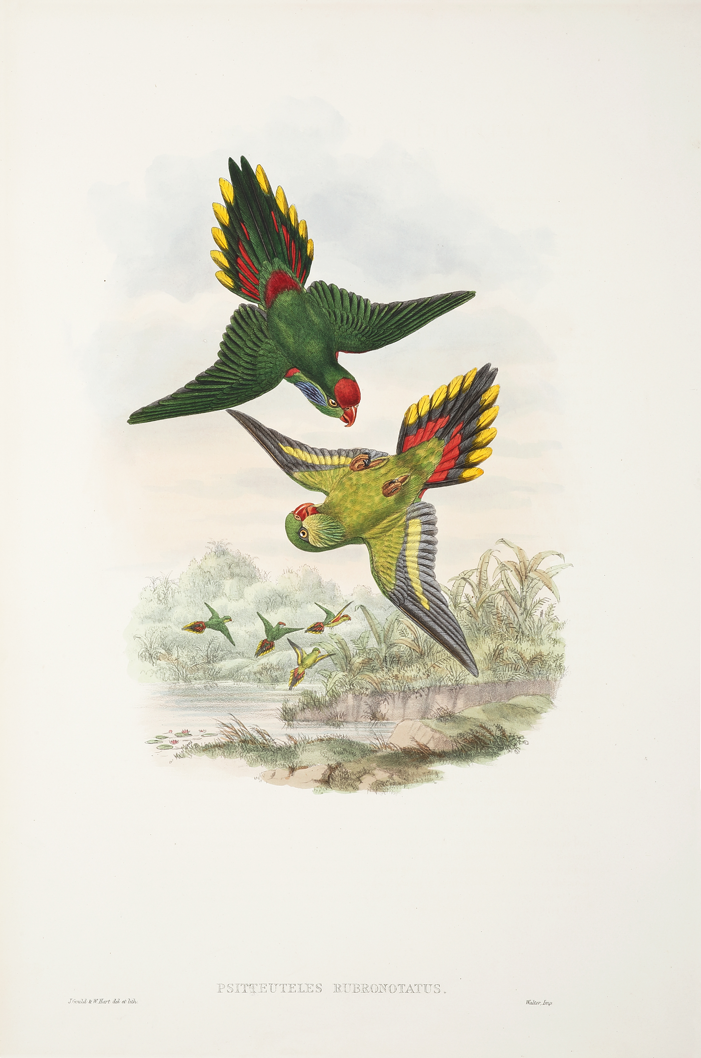 Magnificent hand coloured c.19th lithograph of the Red-spotted Lorikeet, from John Gould’s final work, The birds of New Guinea and the adjacent Papuan Islands, including many new species recently discovered in Australia.