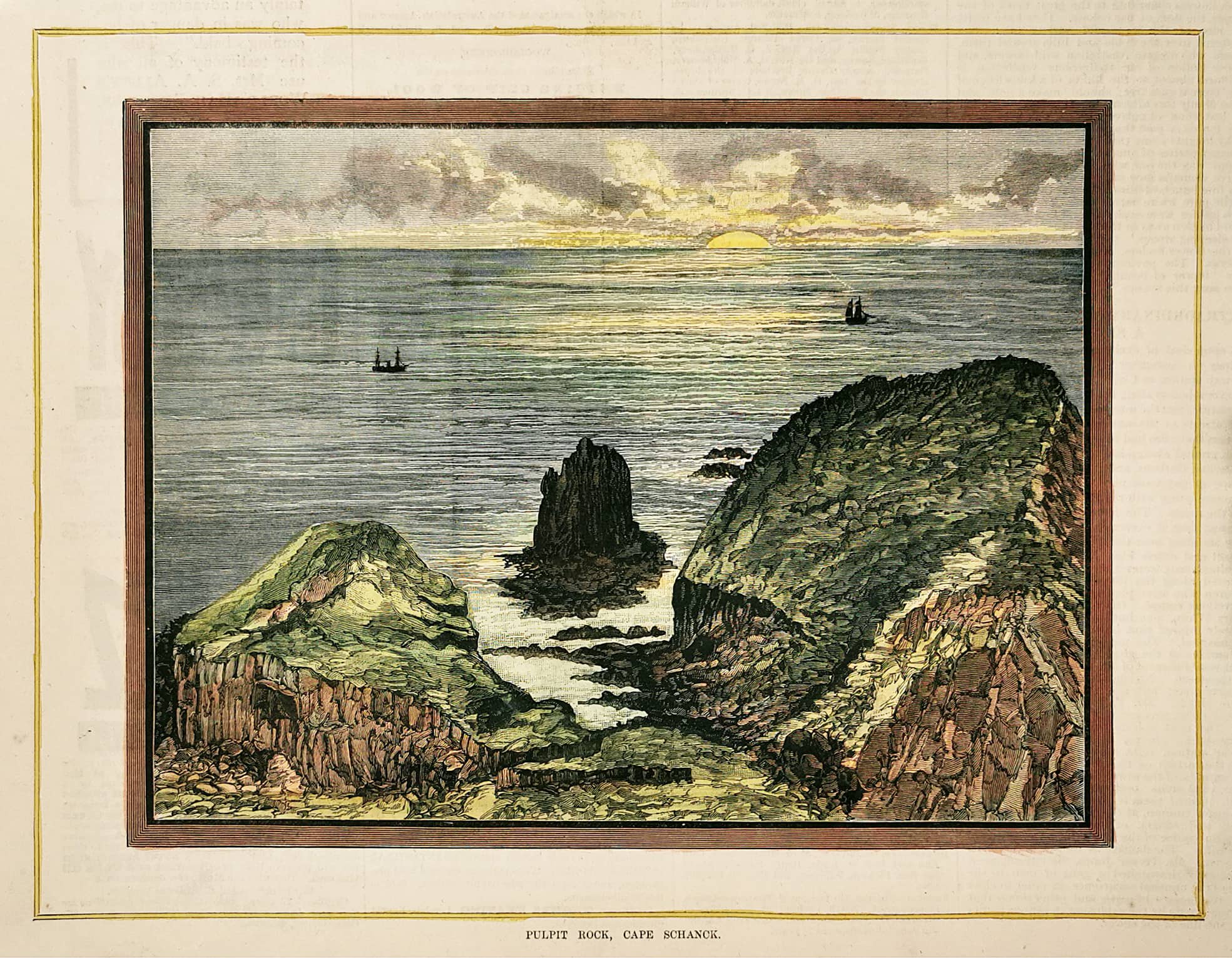 Colonial engraving of the Pulpit Rock in Cape Schanck.