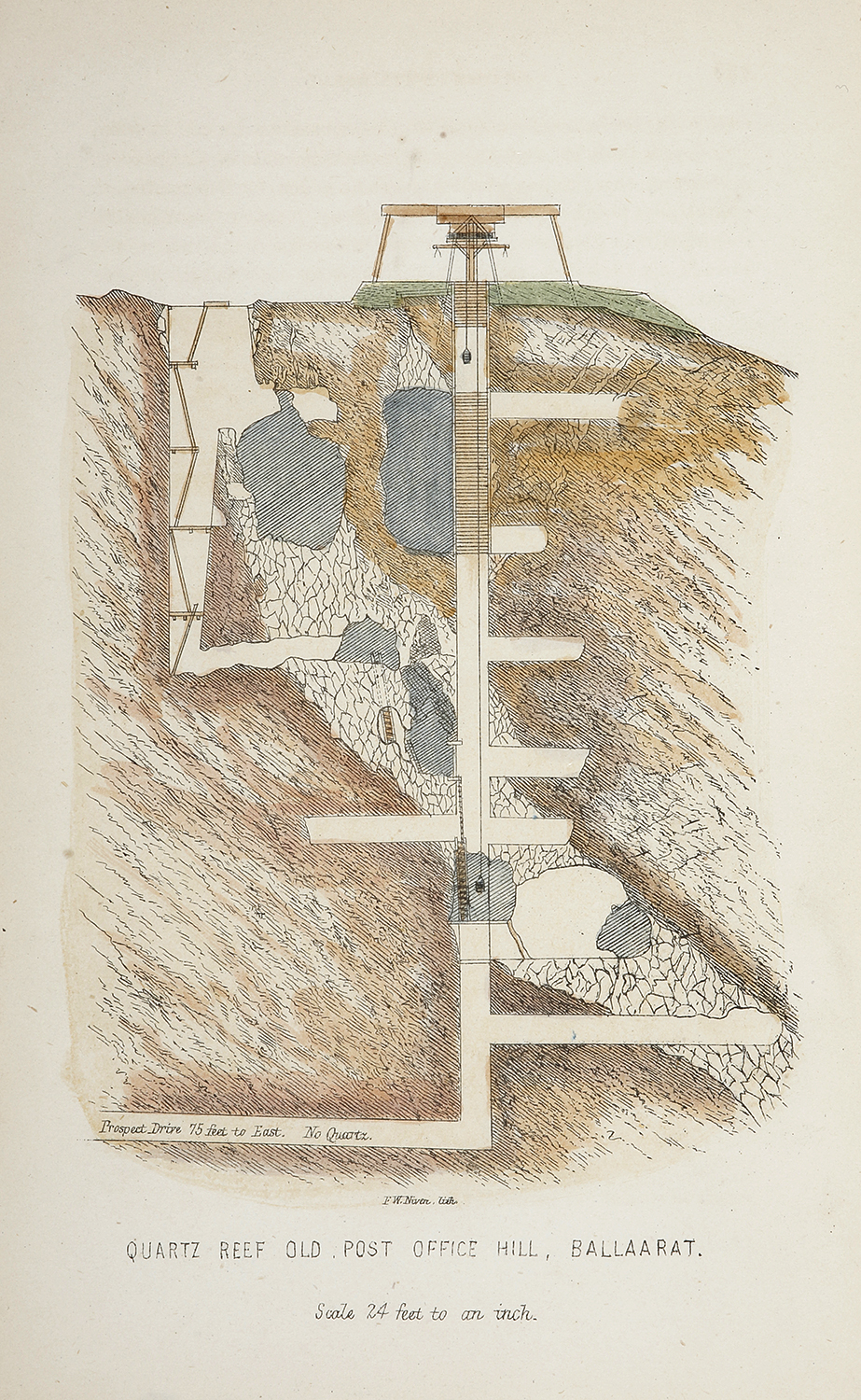 Scarce c.19th hand coloured lithograph of the Quartz Reef Old Post Office Hill, Ballarat.