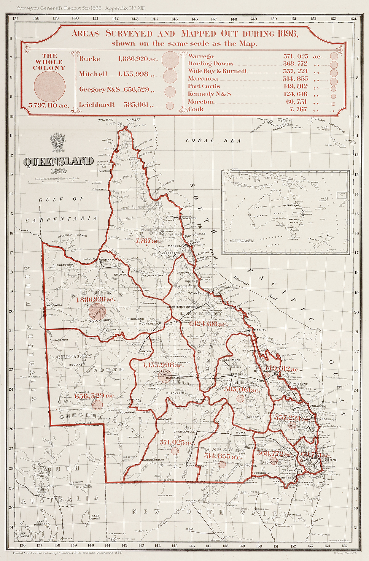 Detailed map showing the areas surveyed in red by the Queensland Surveyor General’s Department during 1898 with an inset map of Australia at centre right.
