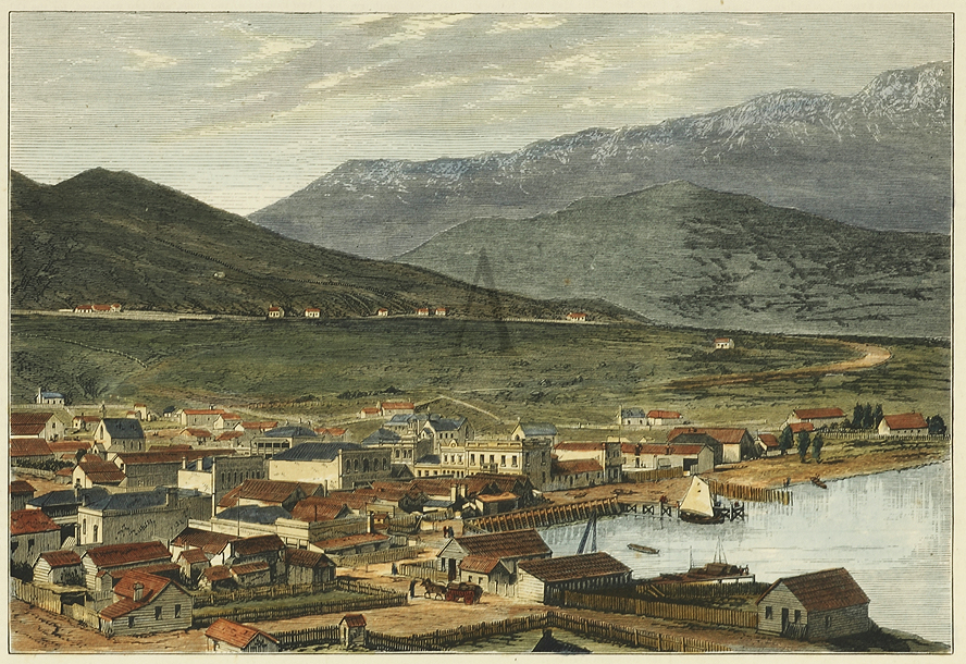Rare early colonial engraving of Queenstown in 1876. From the original edition of the Australasian Sketcher. Collections: State Library Victoria: Accession no: A/S 08/07/76/60