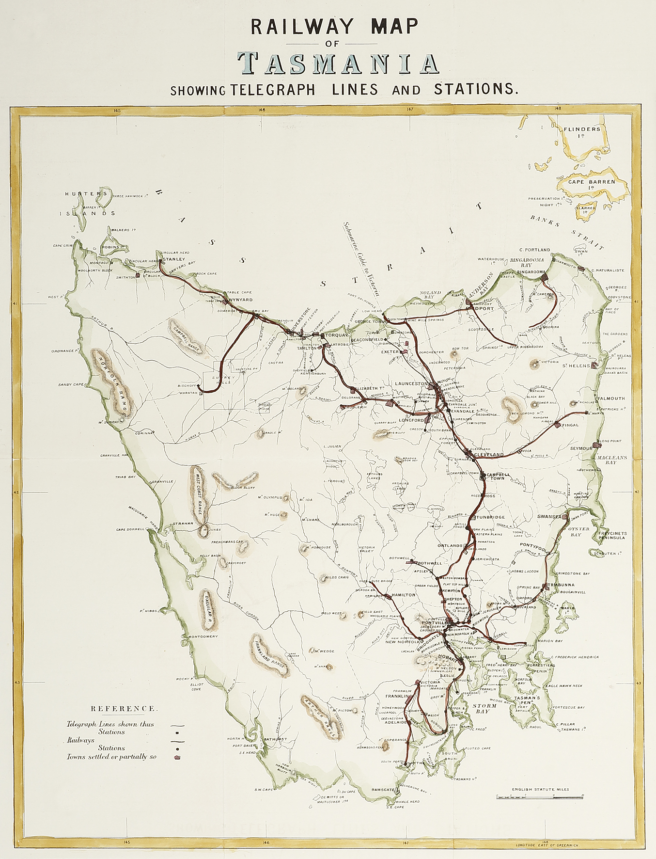 Detailed railway map of Tasmania showing telegraph lines and stations.