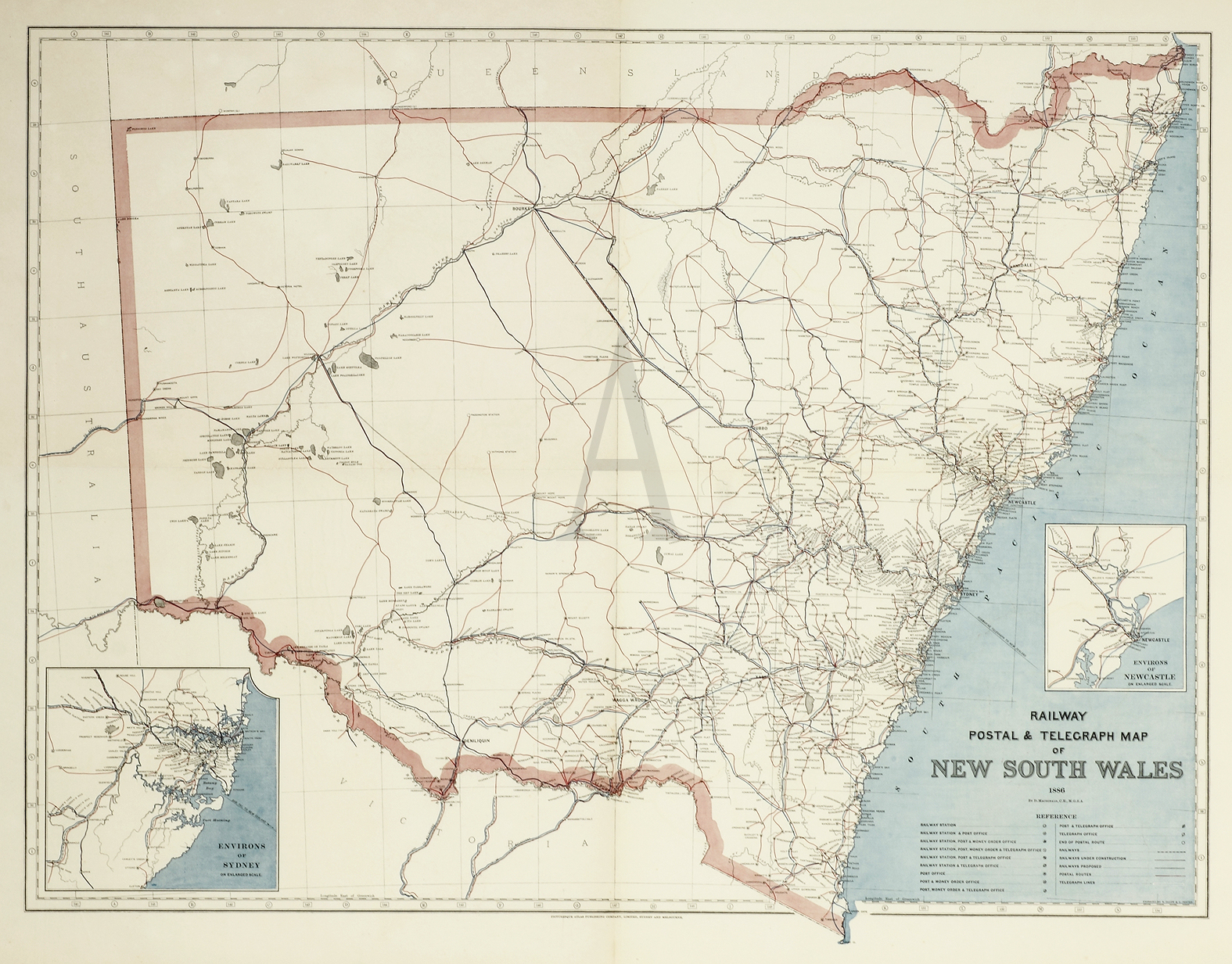 Very detailed large scale map of the New South Wales railways. Marked is the extensive colonial railway network, post offices, telegraph and postal routes. Inset of the Environs of Sydney and Newcastle.