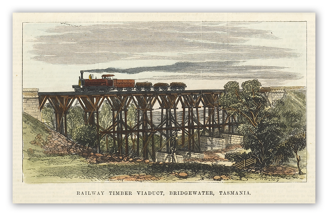 Scarce colonial engraving of the timber viaduct, at Bridgewater, Tasmania.