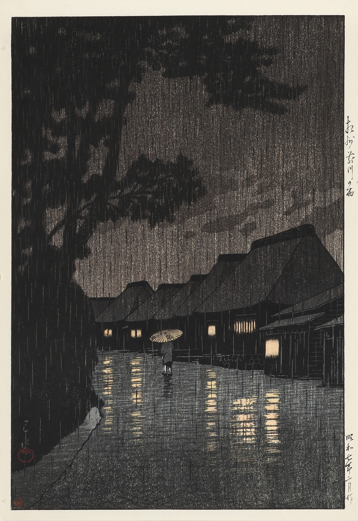 He is now recognised as “Japan’s best print landscapist since Hiroshige.” Initially obliged to work in his family’s rope and thread business, Hasui only turned seriously to art after persistent efforts to study with Kiyokata Kaburagi. Rejected at first, he was encouraged to pursue Western painting, before finally being accepted as Kaburagi’s pupil. In 1917, inspired by Shinsui Itō’s Eight Views of Ōmi, he approached the publisher Watanabe Shōzaburō, for whom he designed three trial prints. Over the next four decades he created more than 600 woodblock prints, some in editions of up to 3,000, achieving lasting commercial and critical success. Hasui’s atmospheric fūkeiga (“landscape pictures”) gained wide international popularity. His celebrated image of a lone figure walking at night in heavy rain epitomises his preference for quiet, melancholy scenes, of which he wrote: “I love quiet scenes with the shadow of loneliness hanging over them.” That mood was shaped by his manipulation of scale and depth, and by his mastery of bokashi (tonal gradation), learned from Kobayashi Kiyochika’s kōsen-ga (“pictures of light”).