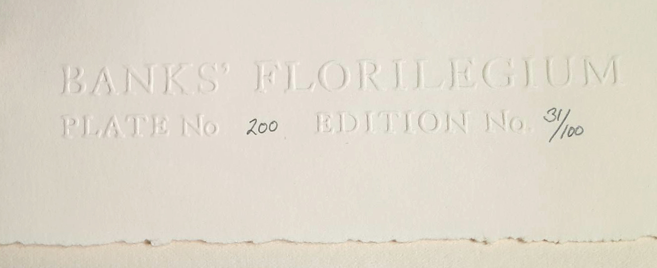 In 1980, the British printing firm Alecto Historical Editions took up the task of finally printing the 743 line engravings originally created between 1772 and 1784. A limited edition of 100 full sets, entitled Banks’ Florilegium, were printed in full colour, directly from the original plates held by the British Museum. The project took 10 years to complete. The plates were printed on an Albion hand roller press. Up to 15 colours were inked by hand onto every copperplate for each print pulled. Each plate is numbered in pencil with the set number.