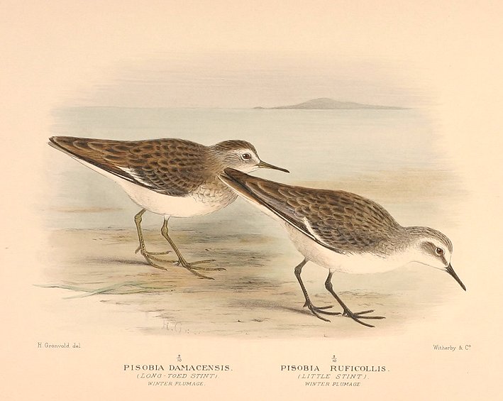 WINTER PLUMAGE 1. Distribution: Migrates to Australia from Siberia in winter.Non breeding migrant. First described by Middendorff 1851. 2. Distribution: Migrates to Australia from Siberia in winter. Non breeding migrant. First described by Pallas 1776. Danish born artist who after studying entered the military as a draughtsman. On leaving Denmark he obtained work at the British History Museum in London. This image is from the last great bird series, The Birds of Australia by G. Matthew&#8217s and is rarer than John Gould&#8217s work on Australian birds, with only 225 sets done. It was the last series produced to use hand colouring rather than colour printed lithography for the illustrations. Original lithograph. Rare.