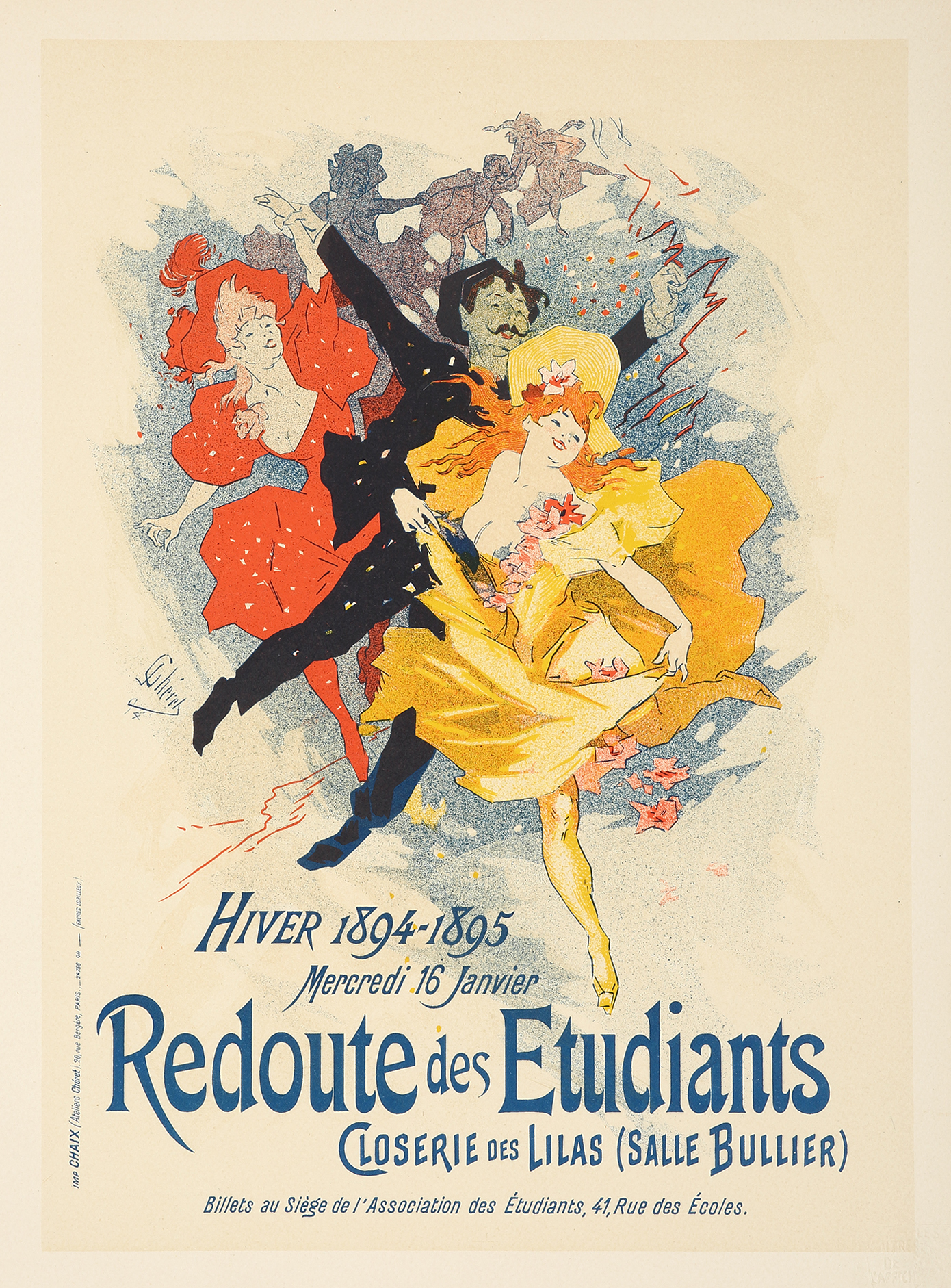 “One of the most ebullient of Cheret’s always animated scenes, this rollicking trio comes at us with verve and gusto. The Folies-Bergere was one of his frequent clients for three decades (60 posters) and so were the Alcazar, the Ambassadeurs, … Read Full Description