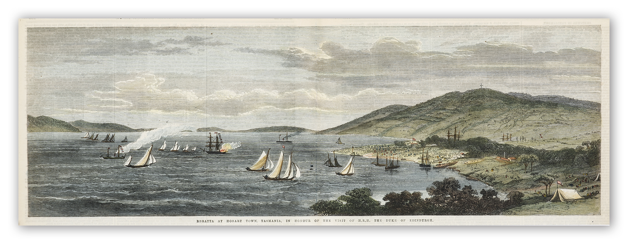 Wonderful colonial engraved panoramic view of Hobart looking south from the Botanic Gardens with a regatta, in honour of the Duke Edinburgh’s visit to Tasmania.