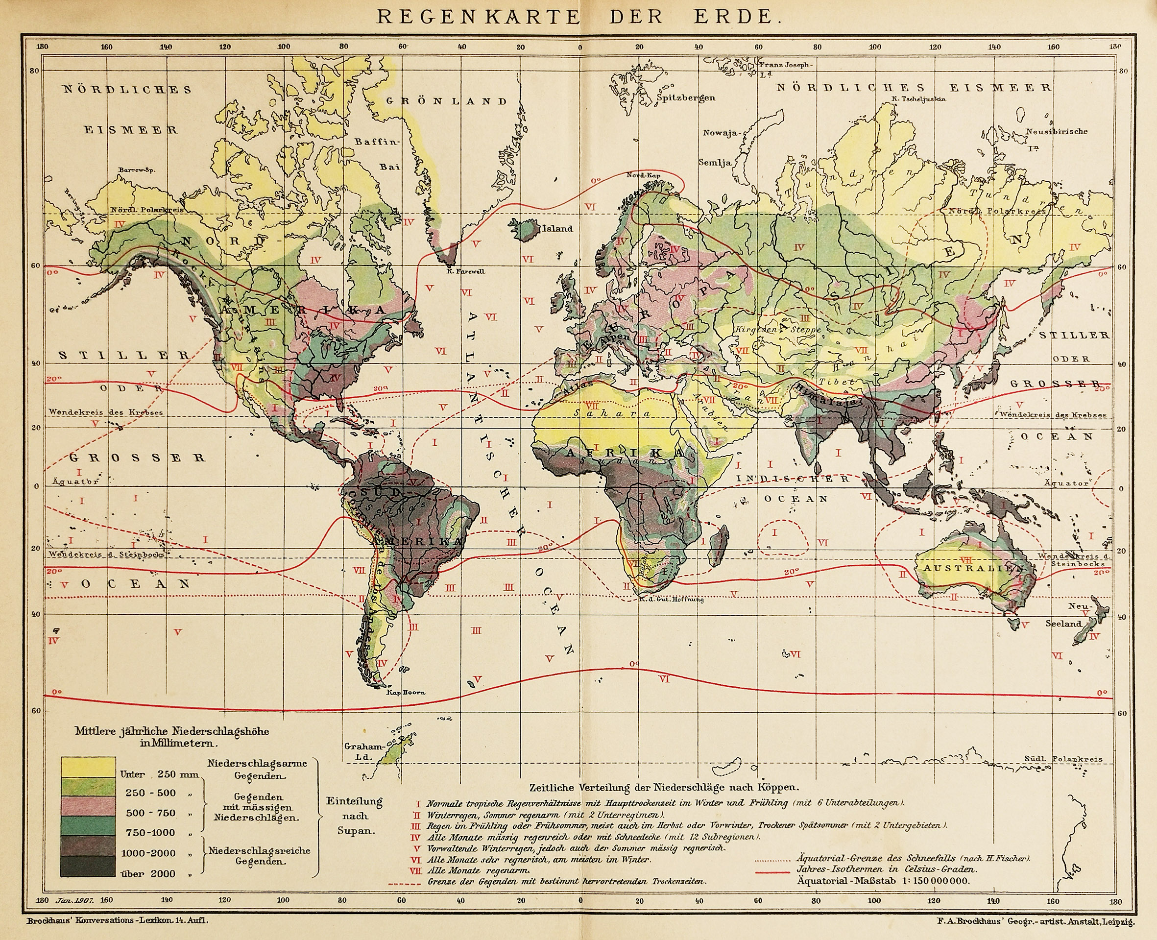 Interesting German map showing the average rainfall across the world. From Brockhaus, F.A. Konversations Lexikon. Collections: National Library Australia: Bib ID 1104411