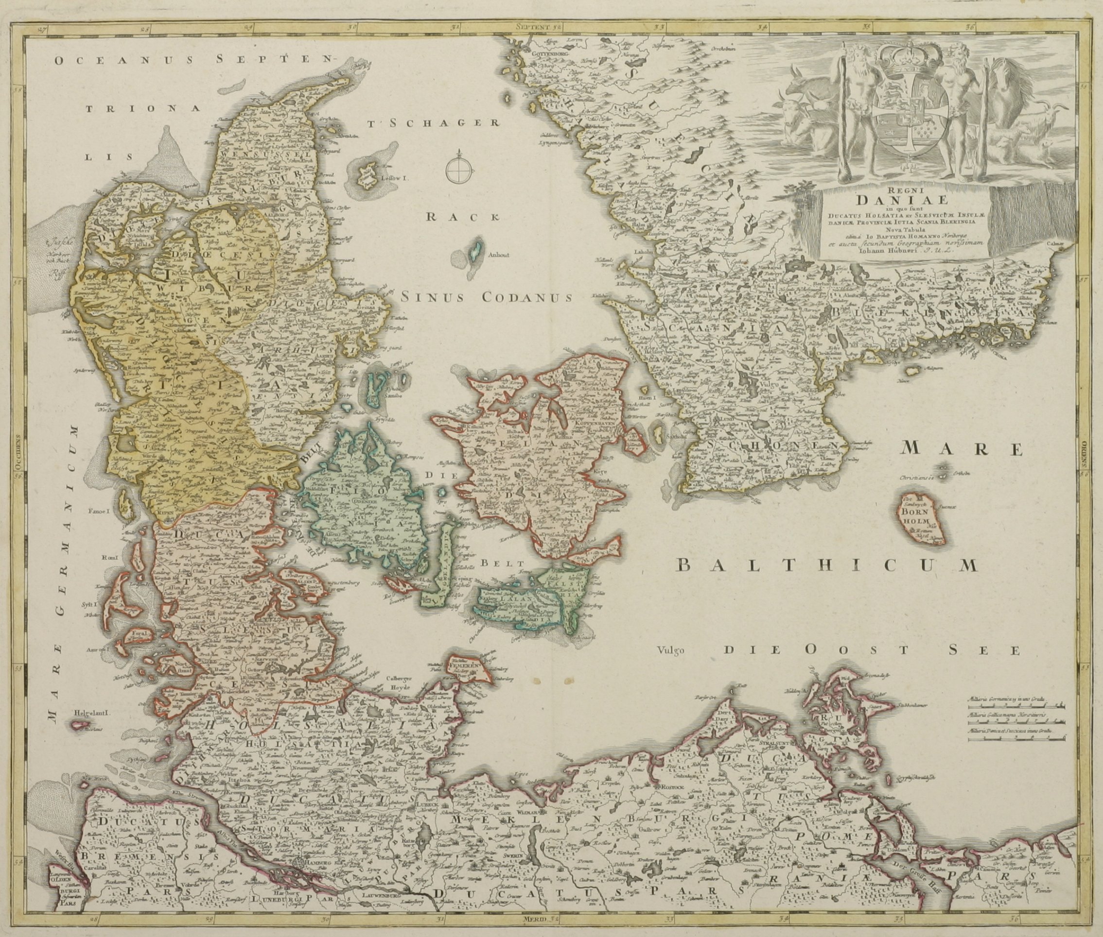 Homann’s map of Denmark, Slesvig-Holstein and contiguous parts of Germany. Very decorative large cartouche includes elaborate coat of arms.