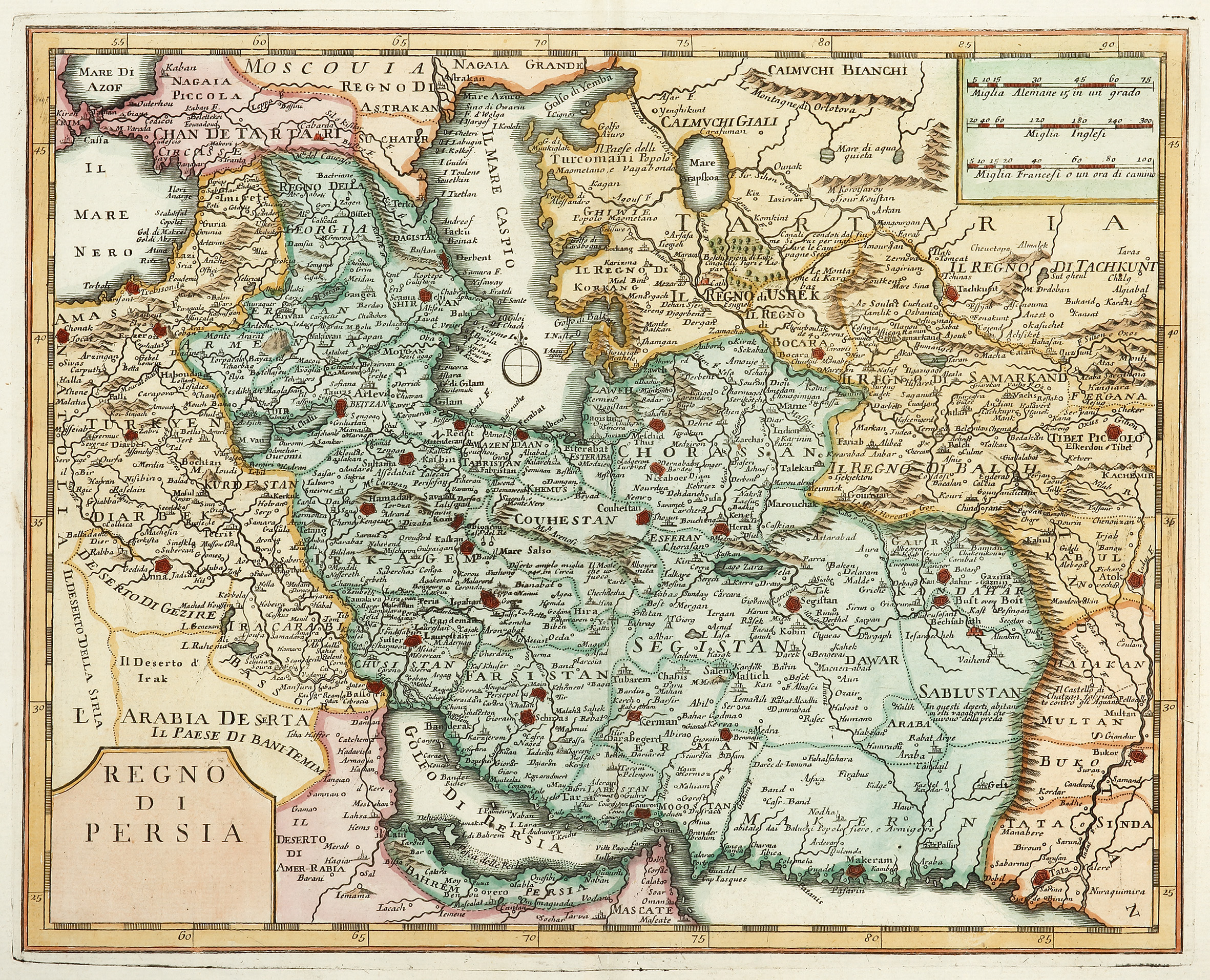 Exquisite and scarce c.18th map of Persia (Iran) by Giovambattista Albrizzi, publisher, patron, collector and one of the great figures of eighteenth-century Venetian intellectual and cultural life.