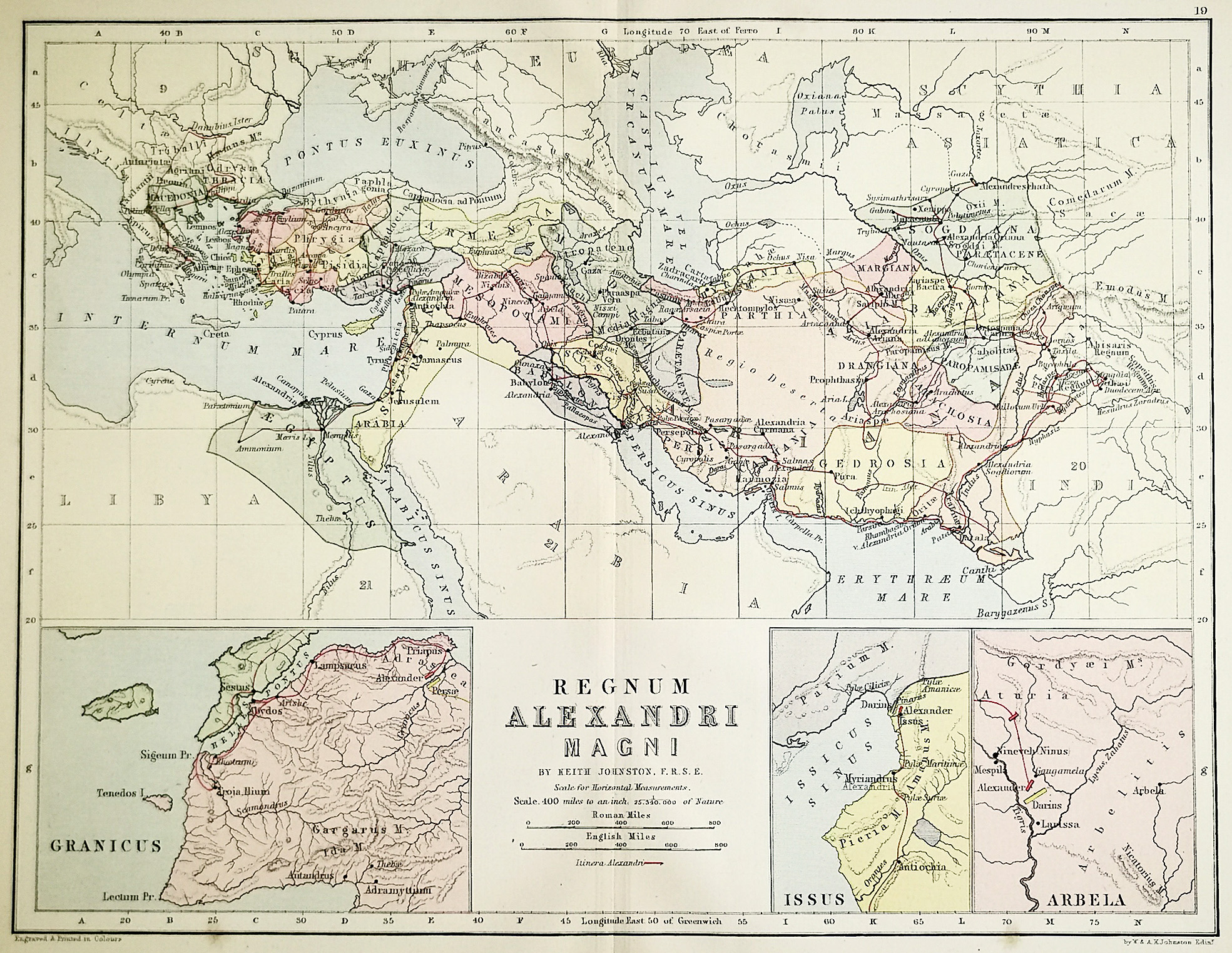 Map of Alexander the Great’s empire with three insets at bottom of; Granicus, Issus and Arbela..