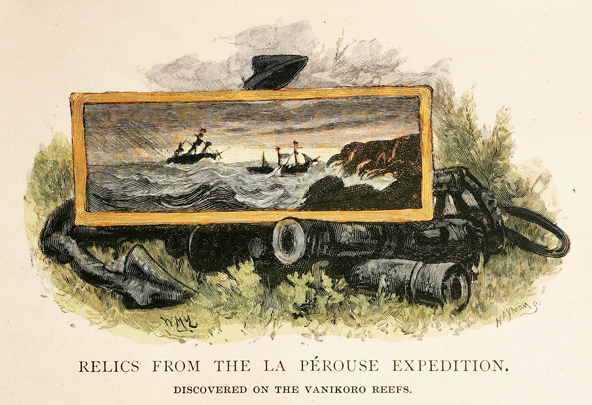 Scarce, c.19th hand coloured engraving of the relics from the La Perouse’s voyage which finally revealed what had happened to the expedition after it had been last sighted by the members of the first fleet just outside Botany Bay heads in 1788.