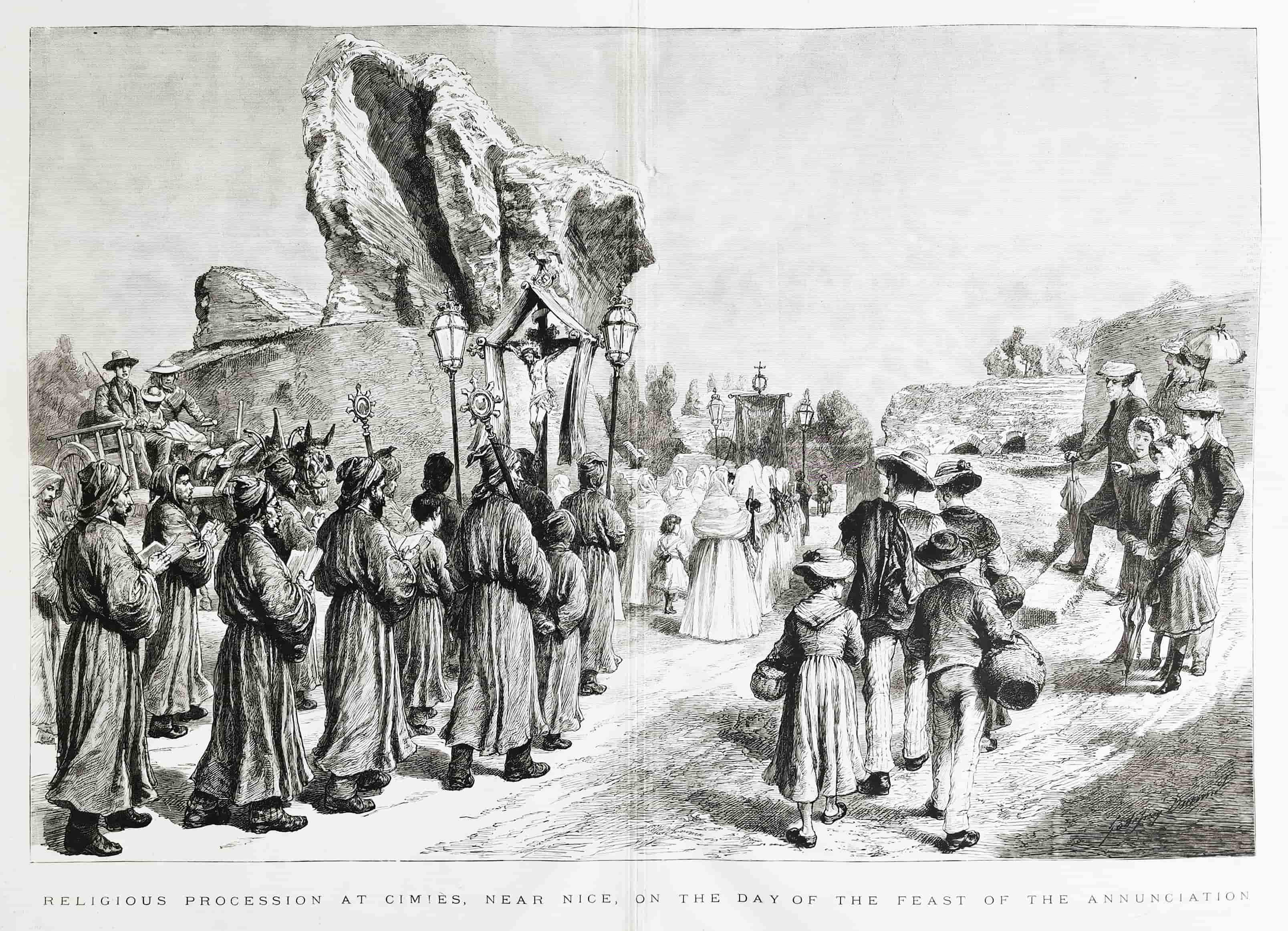 Engraving of a religious procession at Cimiez, a district of Nice, in France. From the original edition of The Graphic.