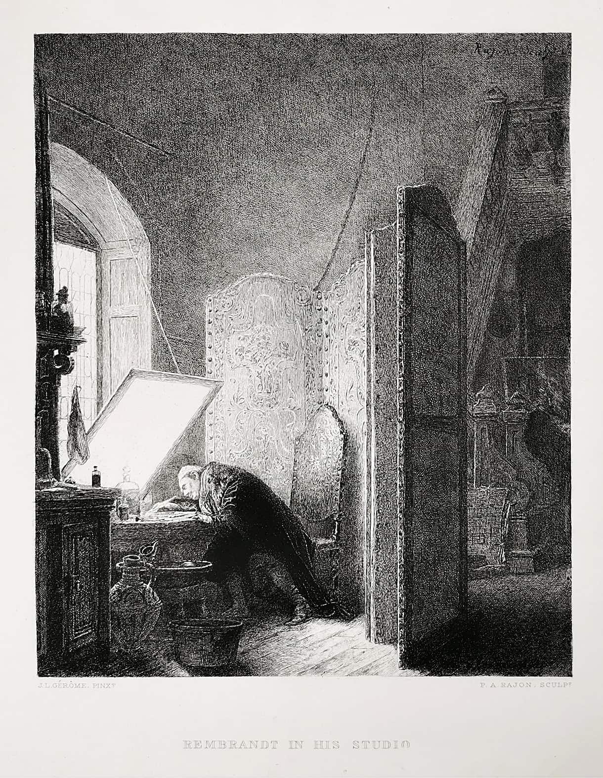 Engraving of Rembrandt Harmenszoon van Rijn (1606 – 1669) in his studio.