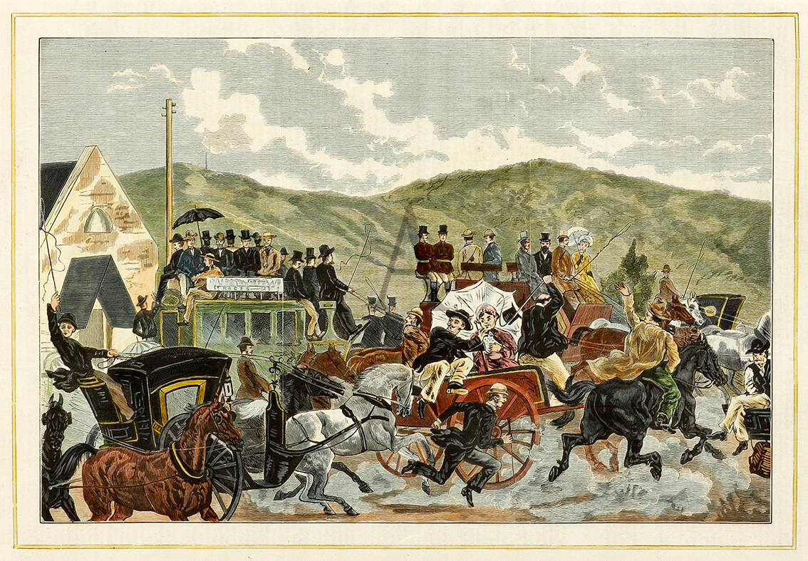 Scarce colonial engraving of a boisterous crowd returning from the Randwick races on New Years Day..