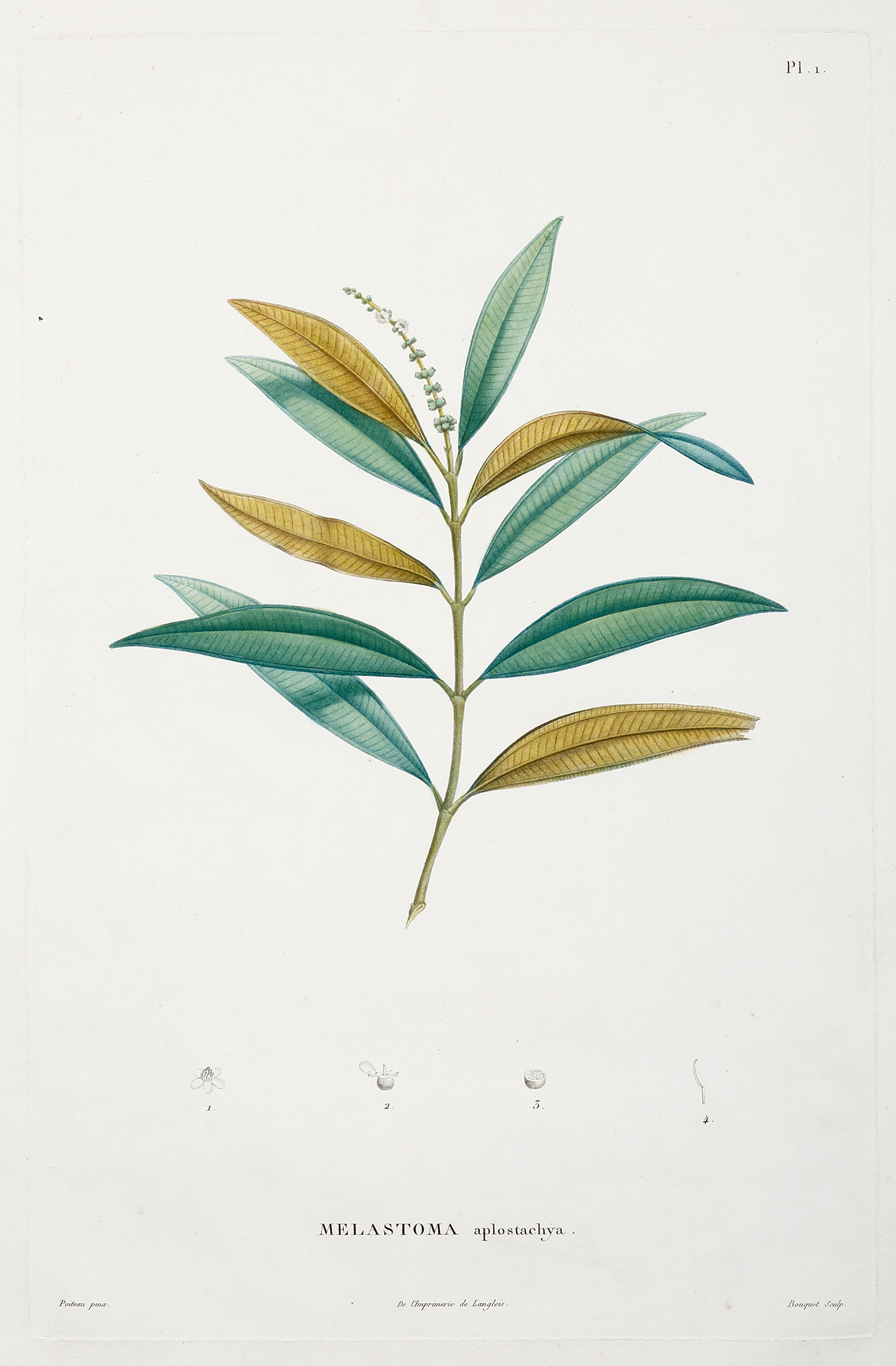 Superb botanical from Alexander Humboldt’s monograph on the species by of the most famous botanical artists, Pierre-Antoine Poiteau. Melastoma aplostachyum Bonpl. is a synonym of Miconia aplostachya (Bonpl. From Alexander Humboldt’s, Monographia Melastomacearum.