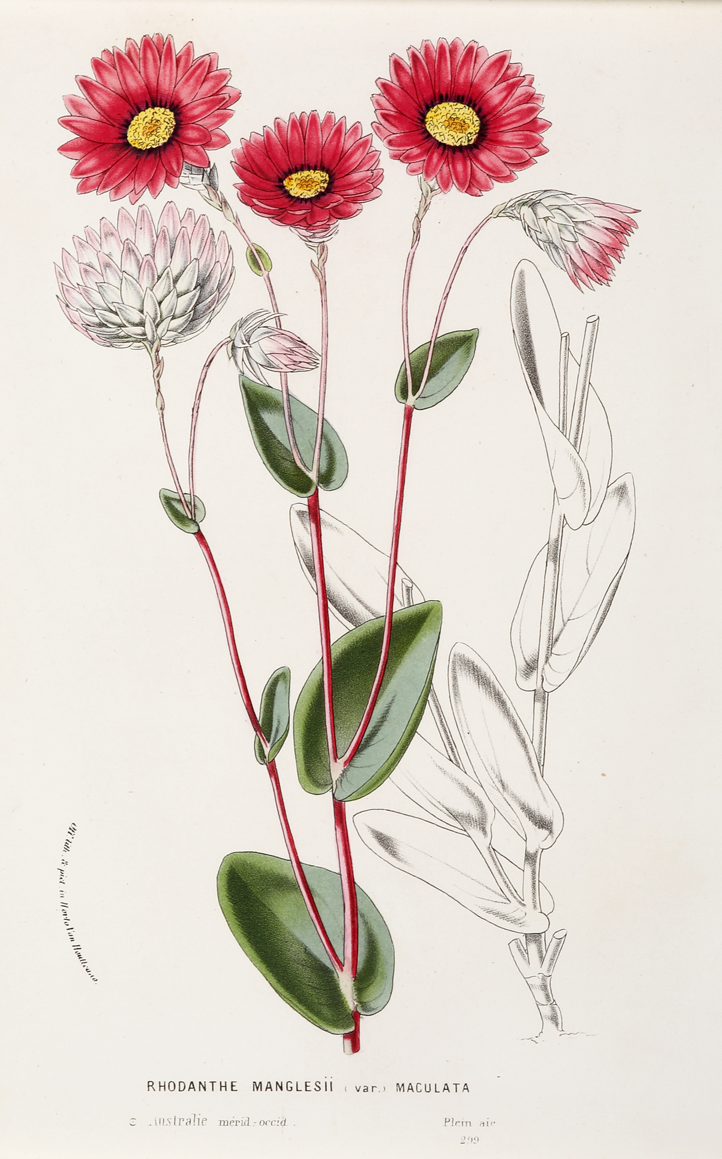 Stunning exotic botanical from Louis van Houtte’s, Flore des Serres et des Jardins de l’Europe (Flowers of the Greenhouses and Gardens of Europe). Common Name: Pink sunray, Silver bells, Australian strawflower, timeless rose or Mangles everlasting. Distribution: Western Australia