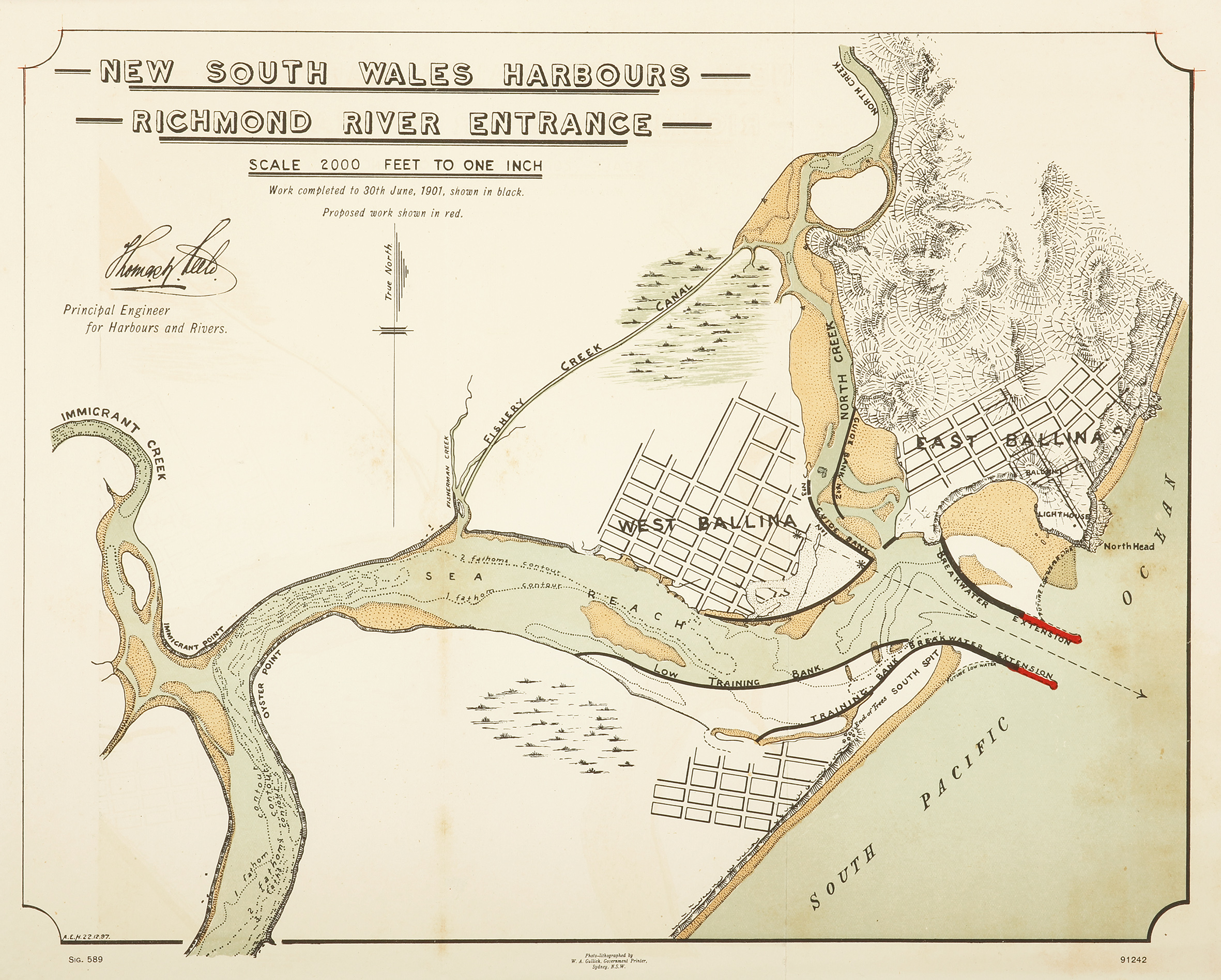 Rare detailed map of Ballina. The map is from the surveys by McKenny, showing depths and mud flats which are coloured brown. Showing improvement and proposed work marked in red, headed by Thomas William Keele, the Principal Engineer of the Harbours and Rivers Branch.