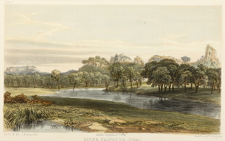 The Nogoa River rises on the Carnarvon Range in the Carnarvon National Park in Central Queensland and flows in a north easterly direction. His fourth expedition was into Queensland in 1845-46. On 15 December 1845, Mitchell started from Buree (N.S.W.) with a large party. He struck the Darling River much above Fort Bourke thence continued to the Narran River, to the Balonne, and to the Culgoa. On 12 April 1846, he came to a natural bridge of rocks on the main branch of the Balonne, which he called St. George Bridge, and which is the present site of the town of St George (Southern Queensland). Kennedy was left in charge of the main body here, and was instructed to follow on slowly, while Mitchell pushed ahead with a few men. Mitchell followed the Balonne to the Maranoa, and then to the Cogoon now called Muckadilla Creek, near Roma. This rivulet led him on into a magnificent pastoral district, in the midst of which stood a solitary hill that he named Mount Abundance. He then crossed a low watershed to the Marunoa, and awaited Kennedy’s arrival. Kennedy overlook him on 3 June 1846, bringing despatches. Leaving Kennedy Mitchell traversed the country at the head of the Maranoa, and discovered the Warrago River. Keeping north over the watershed, he traversed the Claude and Nogoa rivers, and reached the Burdekin River, which he found was a tributary of the Biirdekln River, discovered by Leichhardt in 1845. Intensely mortified to find that he was on a tributary of the Burdekin River, and approaching the ground already trodden by Leichardt, he returned to the head of the Nogoa, and struck west again, after dividing his party and forming a stationary camp. He then continued west, and discovered the Barcoo River. It was on the Barcoo River that Mitchell first noticed the now famous grass that bears his name. On his homeward journey he followed down the Maranoa River to St. George