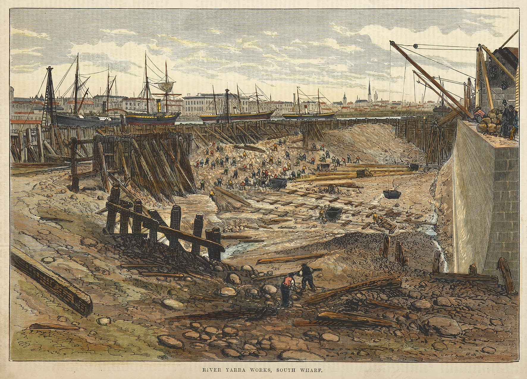 Scarce view of wharf works on the Yarra at South Wharf. From the original edition of the Australasian Sketcher.