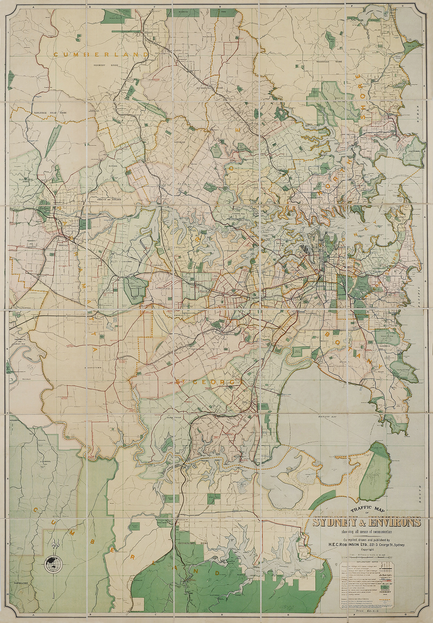 Rare, very large scale c.20th detailed cased map by H.E.C. Robinson showing Sydney and suburbs railways and tramways.