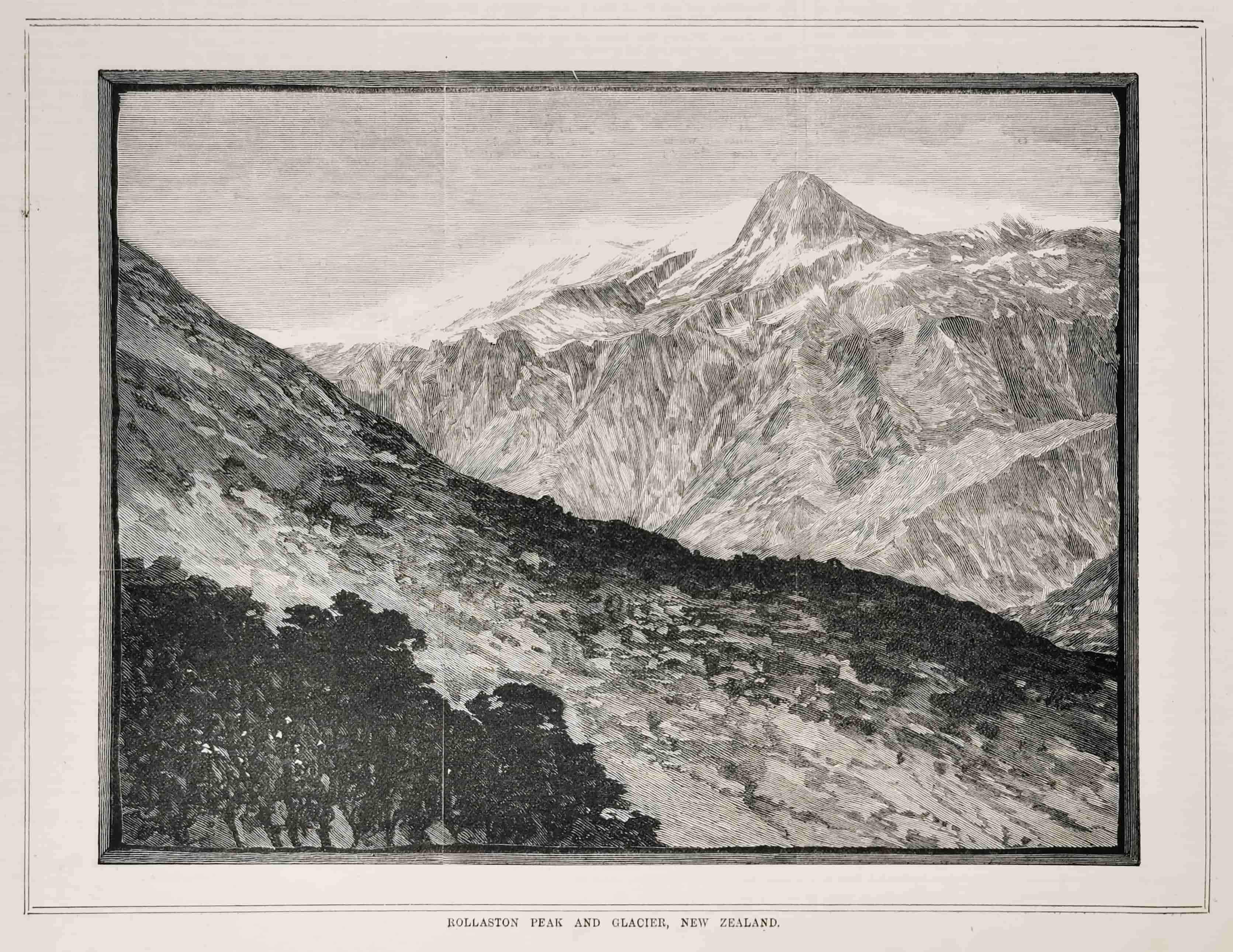Scarce colonial engraving of Mount Rolleston, in Arthur’s Pass National Park, New Zealand.