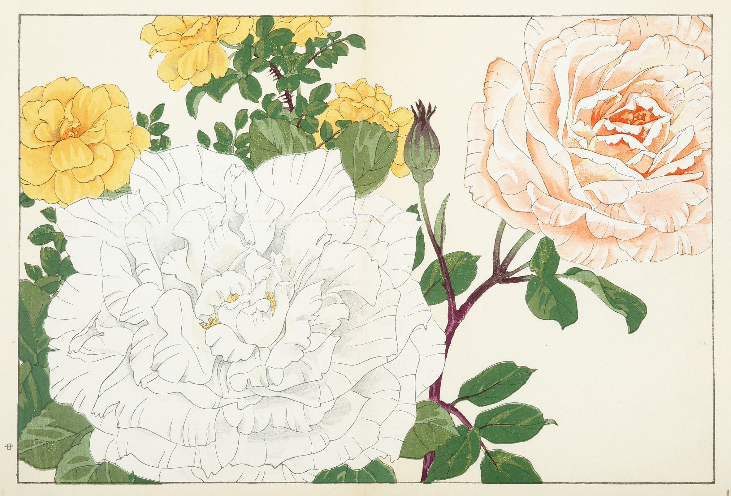 Woodblock of Roses by Tanigami Konan from the series, Seiyo Soka Zofu, or a Pictorial Book of Western Flowers. The woodblock process requires a separate block for virtually every colour. A simple subject by Japanese standards would usually use up to nine … Read Full Description