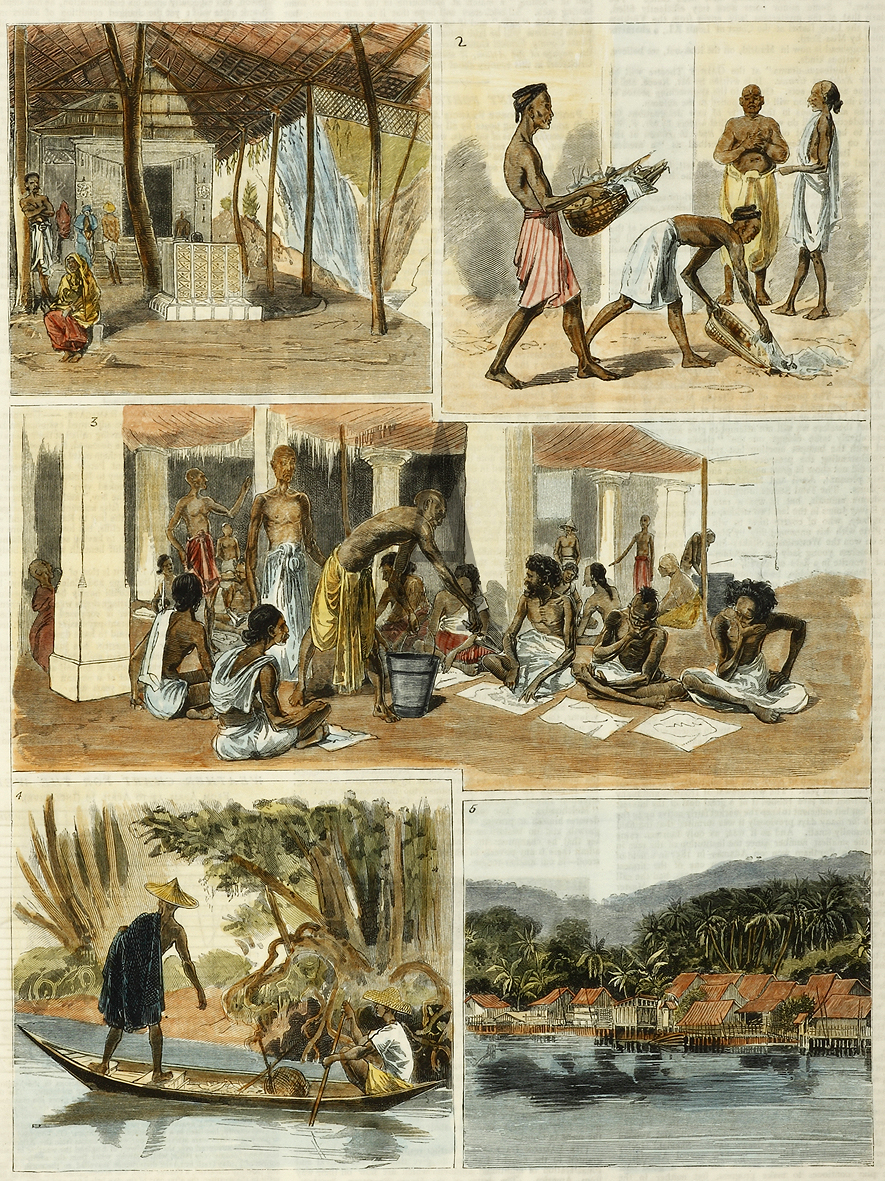 1.Waterfall and Temple 2. Gathering up the Remnants 3.The Feast 4.Malay Fisherman 5.A Malay Village. From the original edition of the The Graphic.