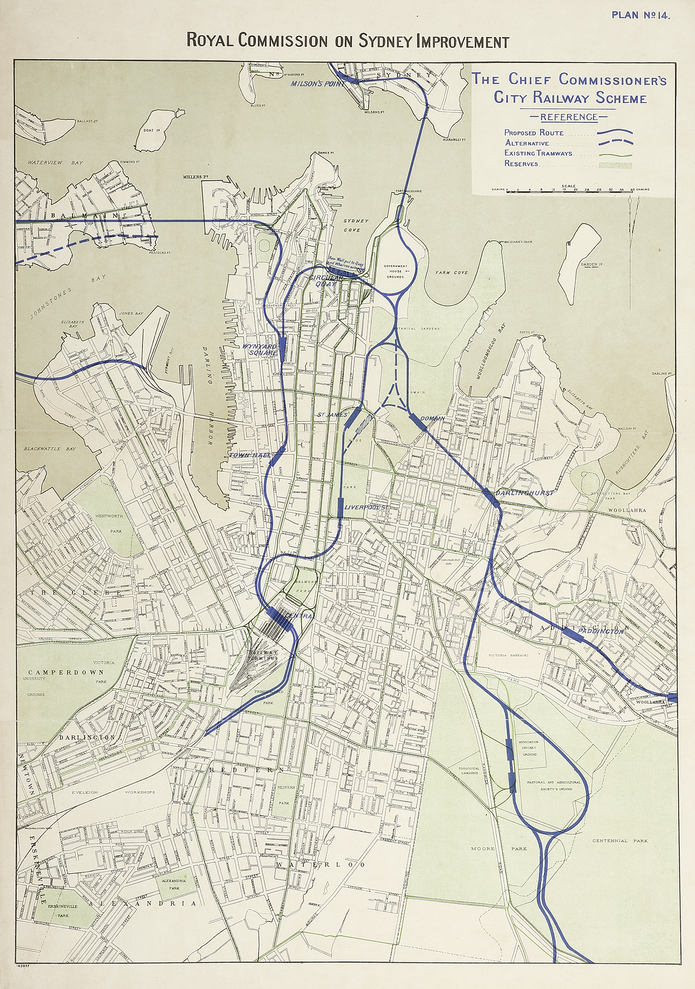 Rare plan by showing Chief Commissioner’s City Railway scheme made for the Royal Commission on Sydney Improvements.