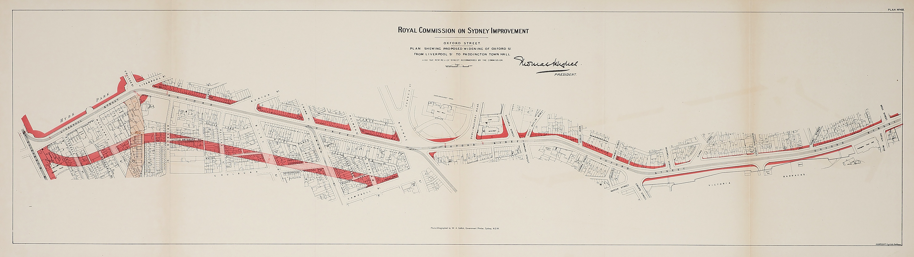 Rare plan by Norman Selfe (1839-1911) showing the proposed new road running along Oxford Street from Liverpool St. to Paddington Town Hall, made for the Royal Commission on Sydney Improvements.