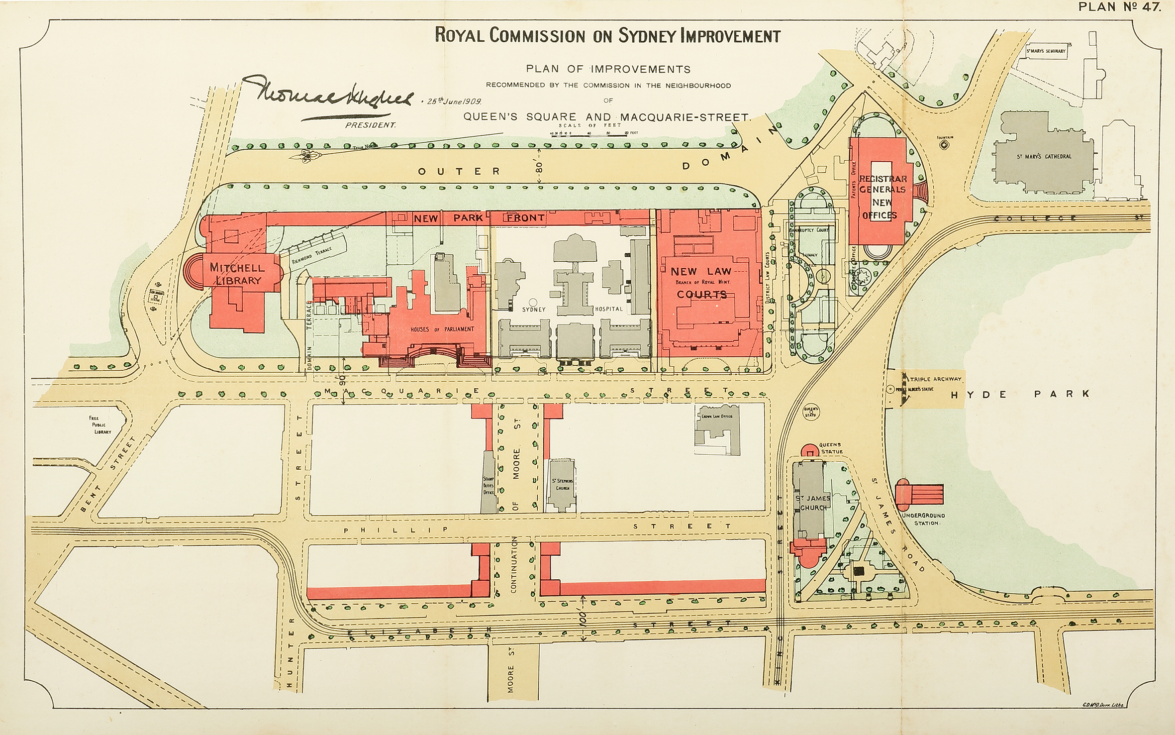 Rare early c.20th lithographic plan by Norman Selfe (1839-1911) showing areas marked for proposed improvements in Queen’s Square and Macquarie Street, made for the Royal Commission on Sydney Improvements