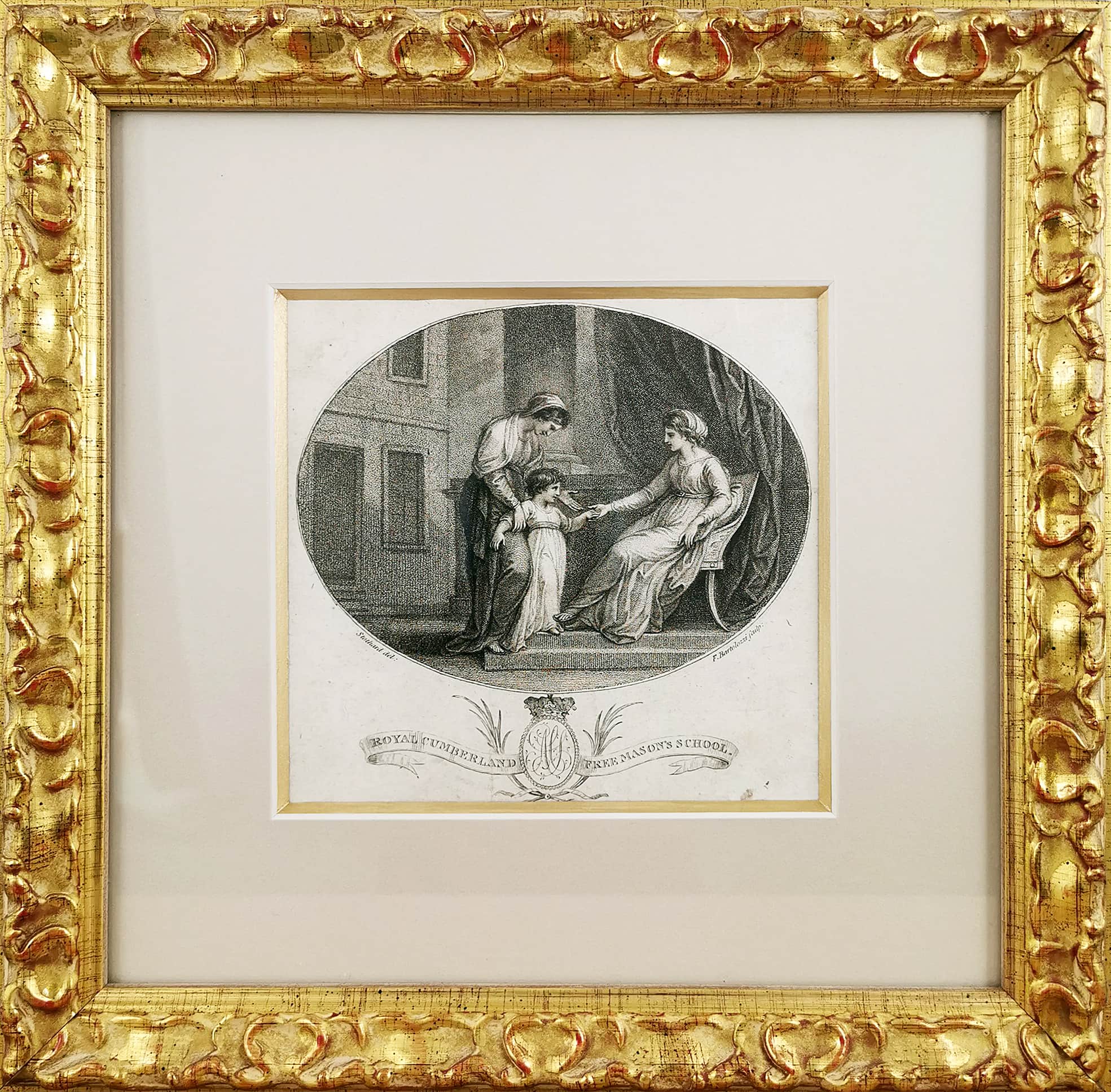 Charming Georgian stipple engraving of a woman seated at the throne, while a girl and her mother greet her.