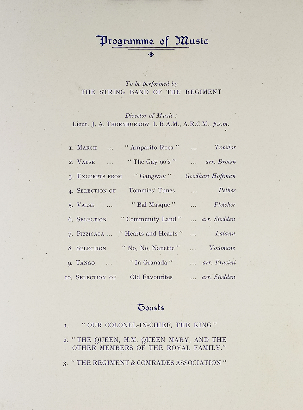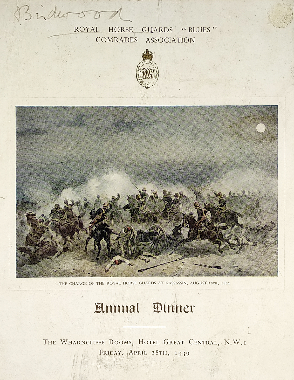 Menu for the Royal Horse Guards Annual Dinner, “Blues” Comrades Association held at the Hotel, Great Central, London. Dated Friday, April 28th, 1939.