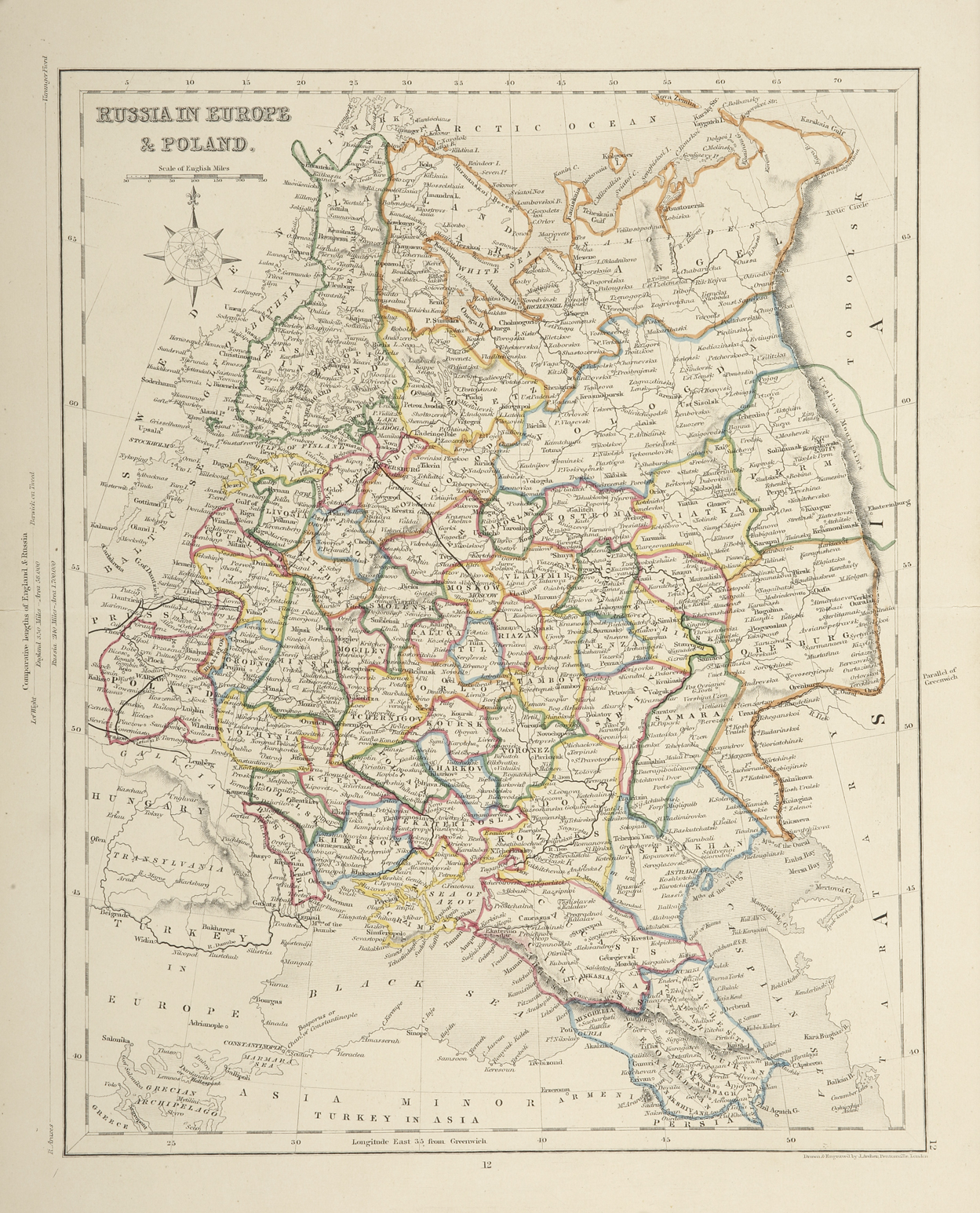 Detailed c.19th engraved map of Russia by Joshua Archer (1792-1863).