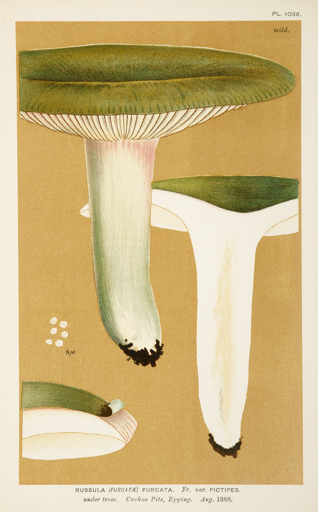 Lithograph of mushrooms from Illustrations of British Fungi by Mordecai Cubitt Cooke (1825 – 1914) who was an eminent mycologist, and the founder of the journal ‘Grevillea and one of the great promoters of mycology in England. ‘Cookes’s most ambitious work, the “Illustrations of British Fungi, is a monumental work of labor and patient application. I am told that not only did he make the original drawings of the plants, but that the figures were actually transferred by Cooke to the stones from which they were printed’ (C.G. Lloyd, Letter no. 57). ‘The number published of the Illustrations of British Fungi must have been very small as there were only 70 subscribers in Britain when volume 2 was issued.’ Stafleu & Cowan