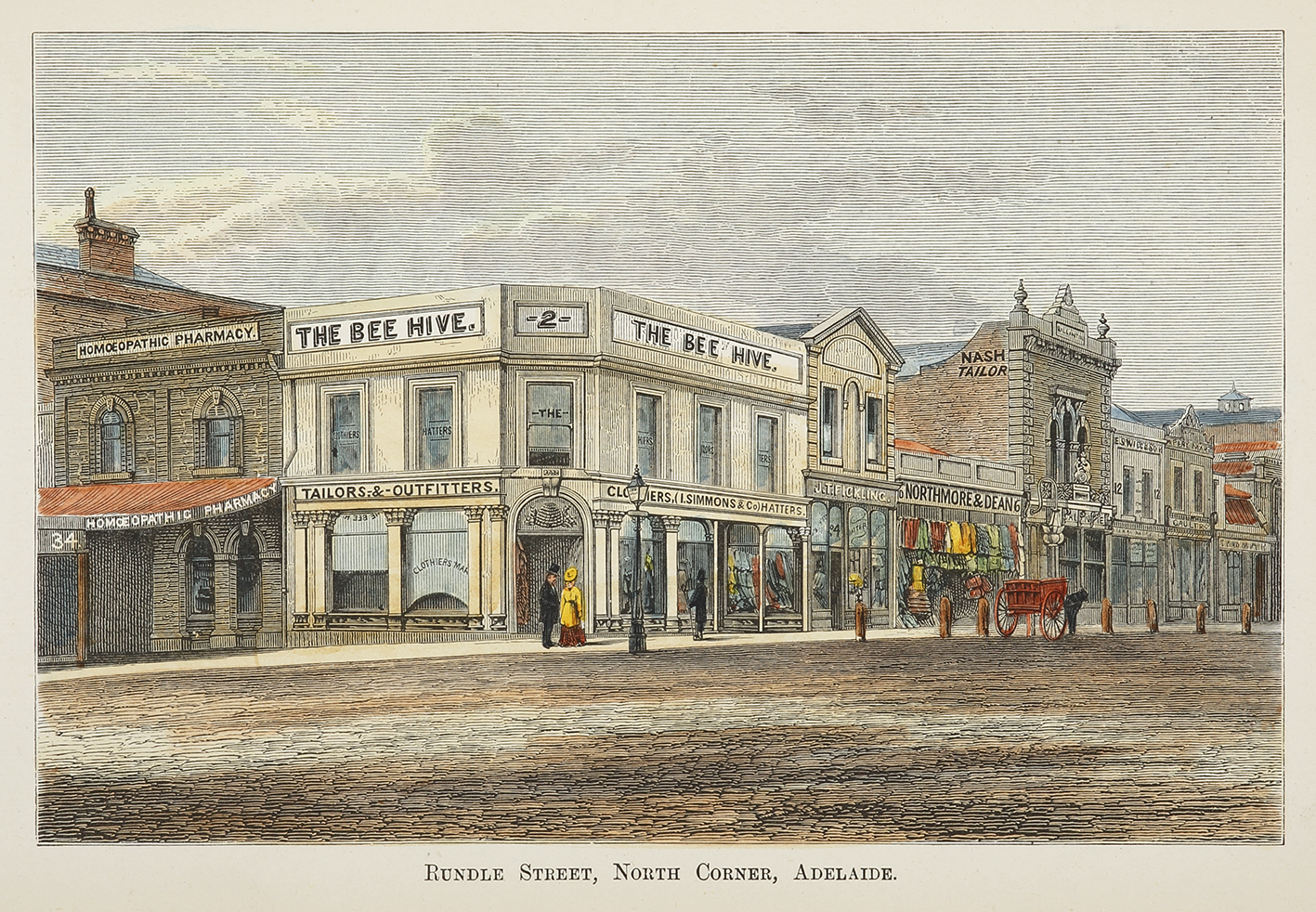 Interesting South Australian colonial image of the second of three buildings that stood on the site known as the Beehive, on the corner of Rundle Mall and King William Street. The Beehive, a draper’s shop was opened by Brewer and Robertson on October 1849, then in the 1860’s it seems to have been altered as in our engraving. The alterations included the removal of the original gabled roof and the extension to the east probably with the acquisition of the neighbouring premises, Pearce Tailors which can be seen in S.T. Gill’s painting 1849. In our image the neighbouring premises on the eastern side is now J.T. Fickling who were tailors. On the King William side the neighbouring premises is a Homeopathic Pharmacy.
