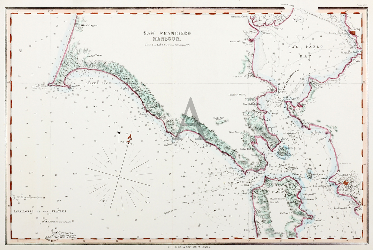Very detailed map of San Francisco with detailed soundings, from the original edition of the Royal Geographic Society Journal.