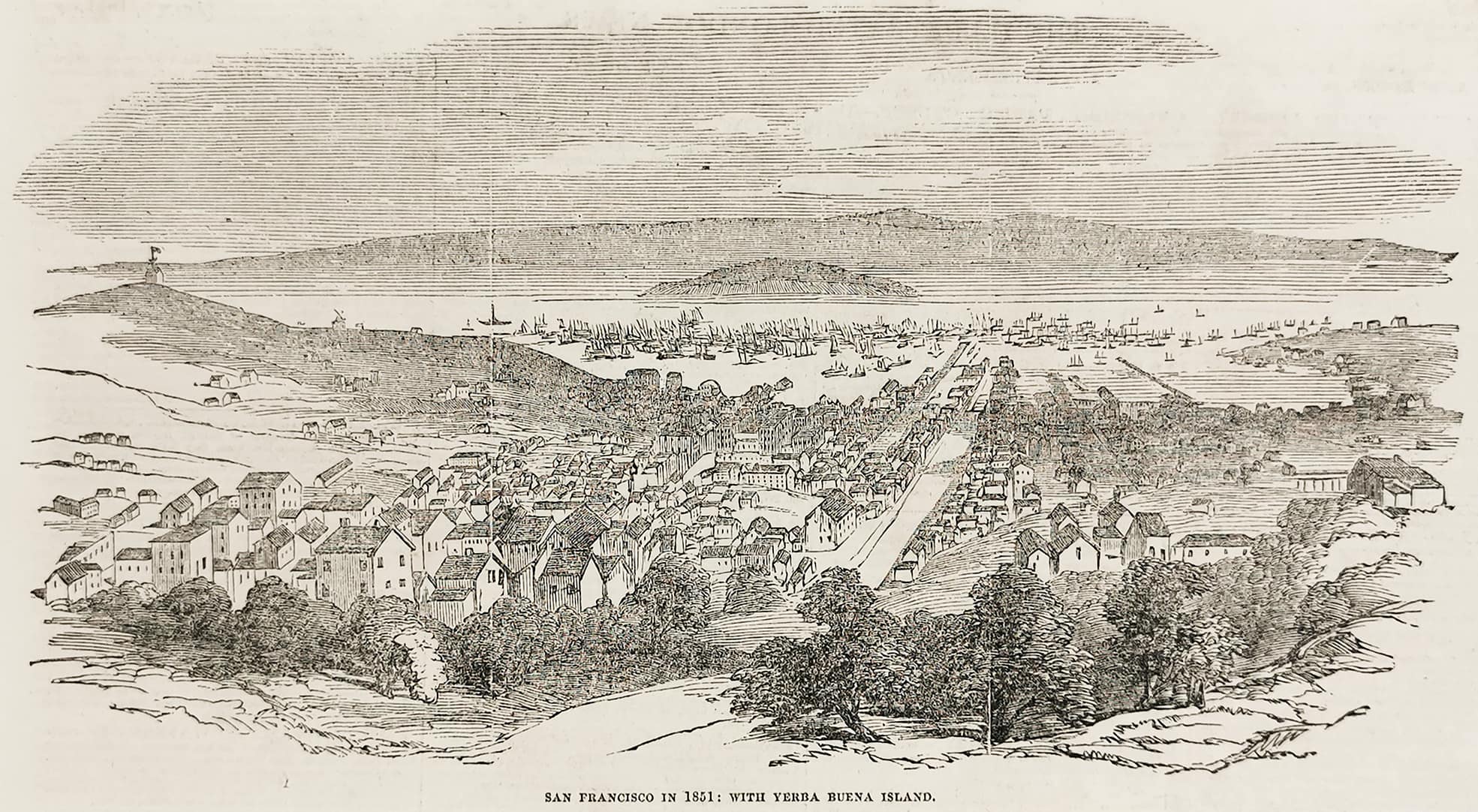 Early engraving of San Francisco, looking down to Yerba Buena Island. From the original edition of The Illustrated London News.