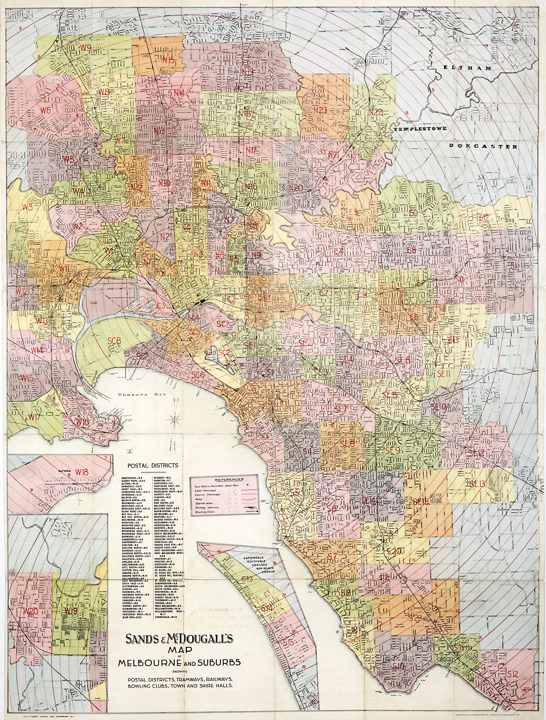 Sands & Mc.Dougall’s Map of Melbourne and Suburbs Showing Postal Districts, Tramways, Railways, Bowling Clubs, Towns and Shire Halls.