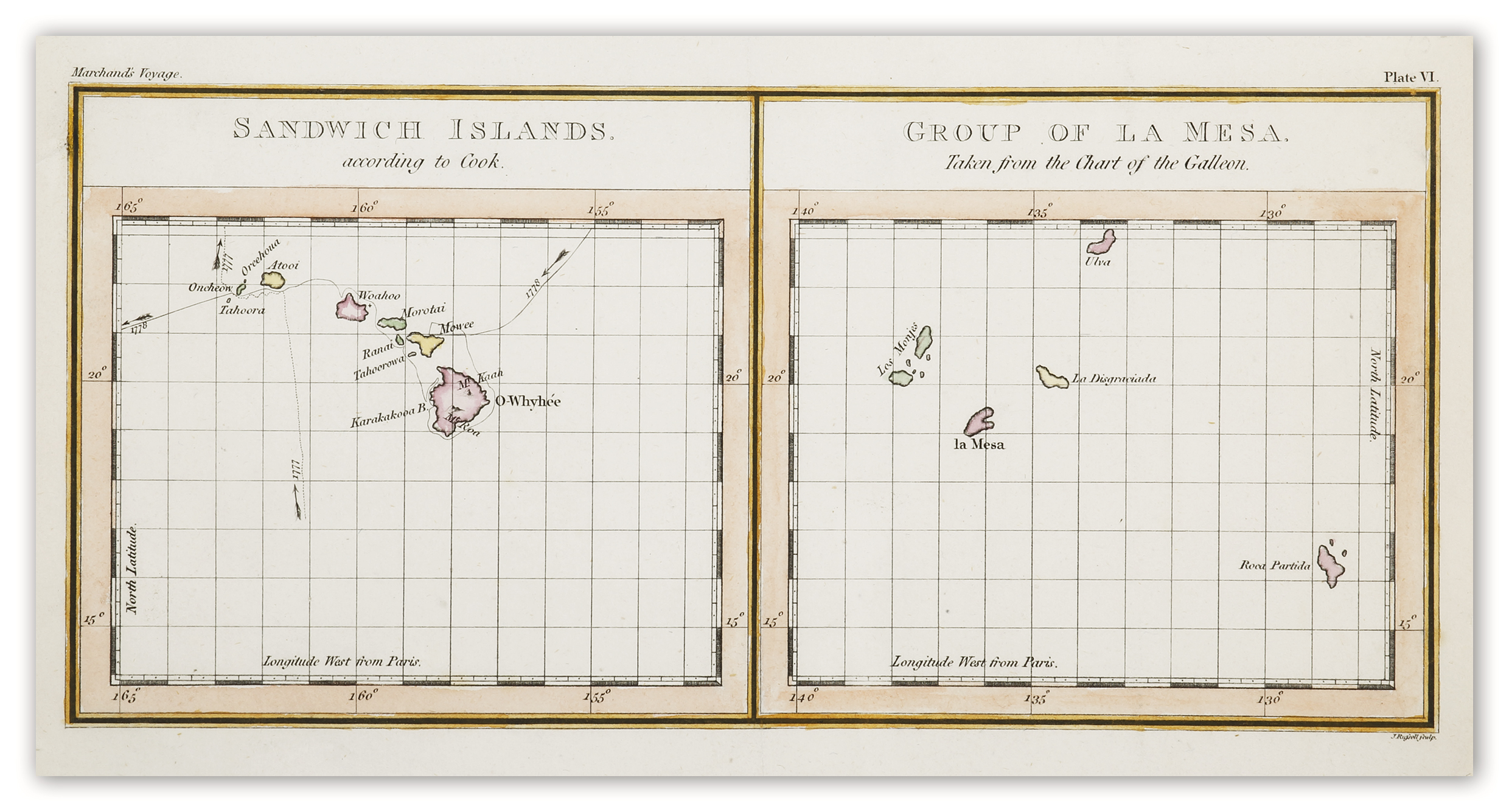 Small map of Hawaii from the accounts of the Solide expedition led by the French navigator Étienne Marchand (1755–1793). Marchand undertook his voyage for the purpose of fur trading with the backing of the French firm Bac, and became only the second Frenchma, after Bougainville to circumnavigate the globe.