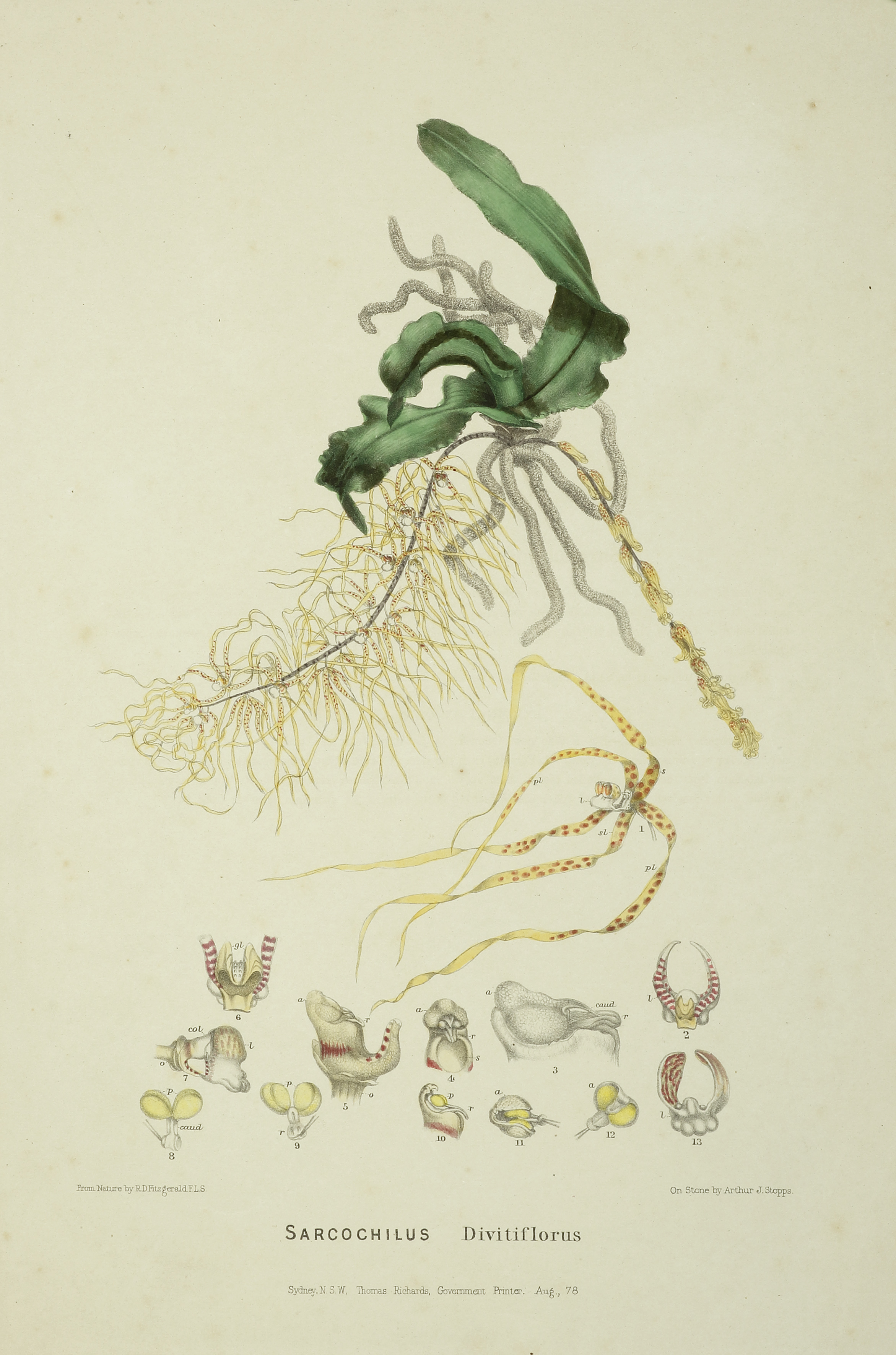 Robert Fitzgerald (1830-1902) Fitzgerald was a surveyor and naturalist, and arrived in Sydney from Ireland in 1856 and soon after was appointed to the Department of Lands as a draftsman for the crown. In his own time Fitzgerald pursued his interest in botany and in 1864 travelled to Wallis Lake, north of Newcastle in New South Wales to collect ferns and orchids which he intended to cultivate around his Hunter's Hill home. This interest in orchids was maintained throughout his life and in 1869, 1871 and 1876 he visited Lord Howe Island to collect further botanical samples. It was during this time that he discovered Dracophyllum fitzgeraldii F. Muell, which was later to be named in his honour. He worked for the Department of Lands and was an enthusiastic field collector, devoting himself especially to the native orchids. The publication of the 'Australian Orchids' was acclaimed throughout the botanical world. J.D. Hooker considered it 'a work which would bring honour to any country and to any botanist', while George Bentham wrote 'thanks to you the Australian Orchidaceae are now better known than those of any country out of Europe'.