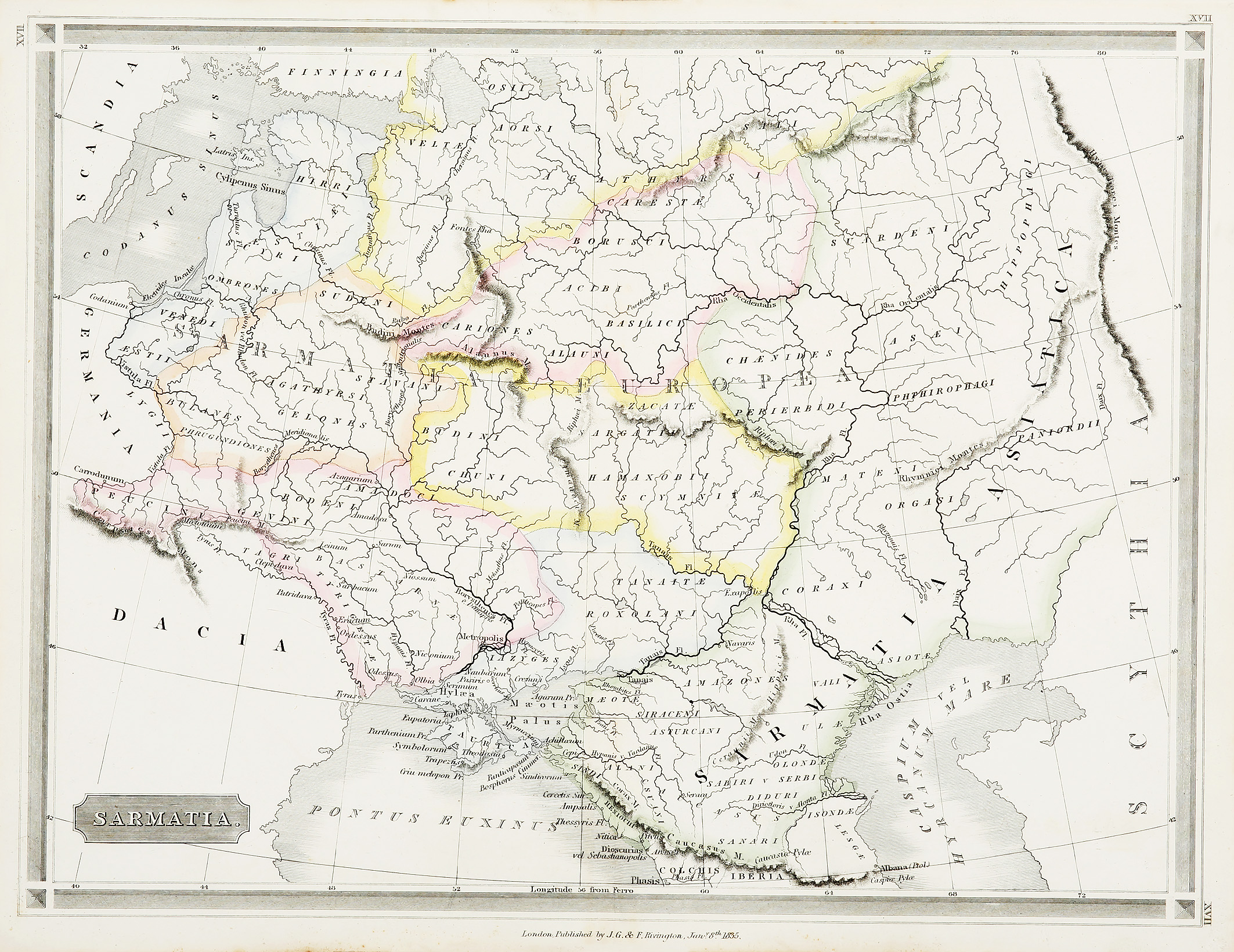 Scarce, c.19th hand coloured engraved map of ancient Sarmatia by the important English map maker John Purdy (1773-1843). From: Bean, J.B. A New Atlas of Classical Geography. St. Pauls Church Yard, & Waterloo Place. London 1835 In classical geography, especially in … Read Full Description