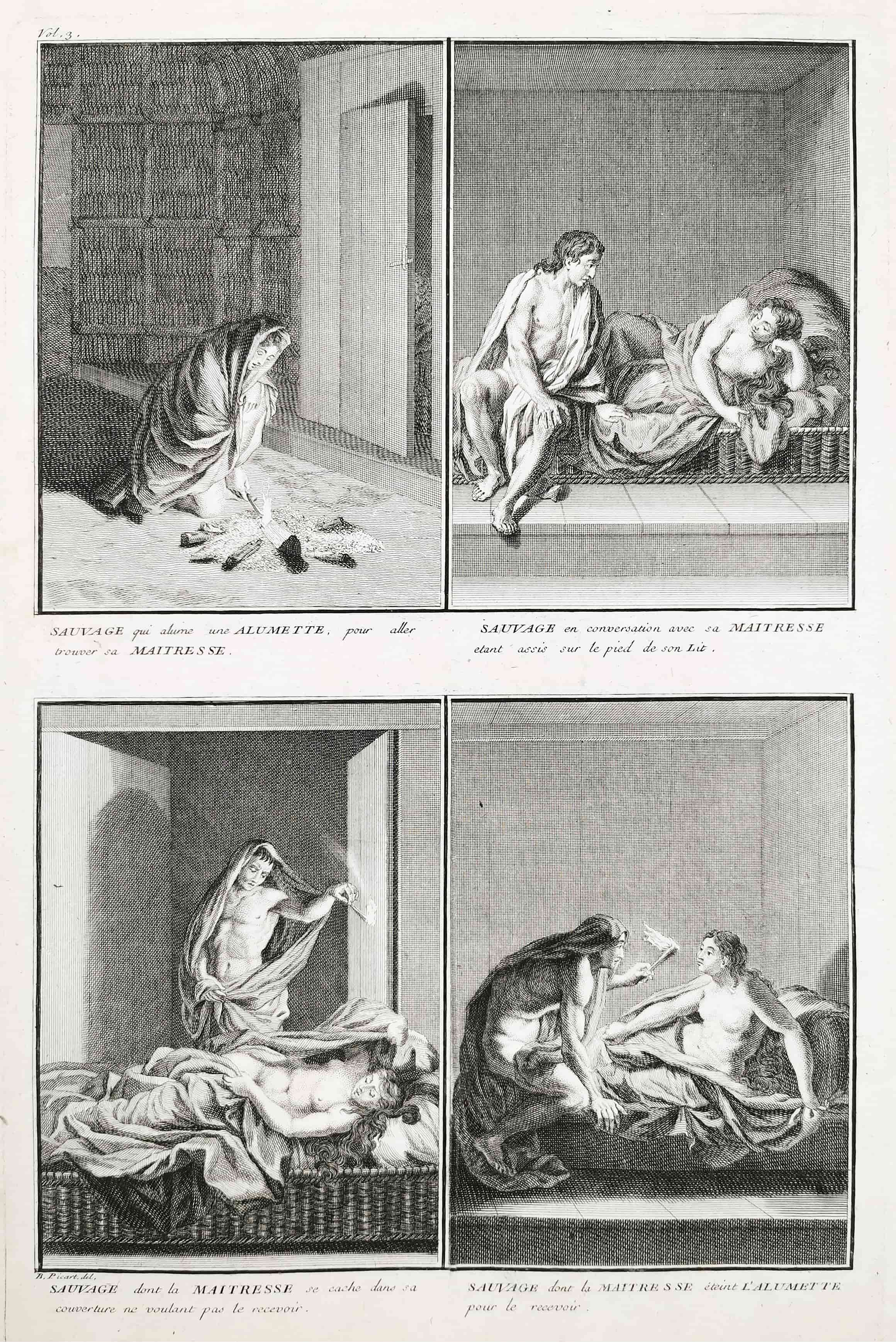 Sauvage qui allume une Allumette, pour aller trouver sa Maitresse. Sauvage en conversation avec sa Maitresse etant assis sur le pied de son Lit. Sauvage dont la Maitresse se cache dans sa couverture ne voulant pas le recevoir. Sauvage dont la Maitresse eteint L’Alumette pour le recevoir.